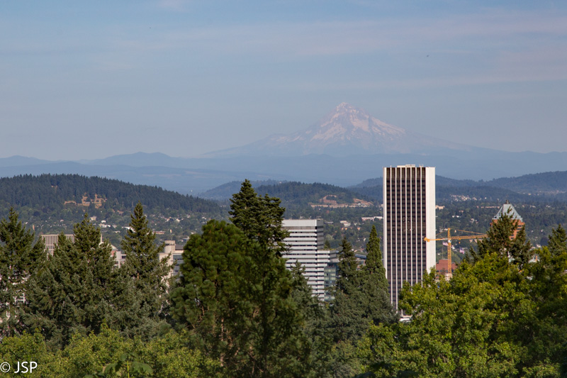 Nuo rožyno terasų matosi kalvose išsimėtęs Portlandas ir sniegu padengtas už 80 kilometrų esančio Hood ugnikalnio kūgis.