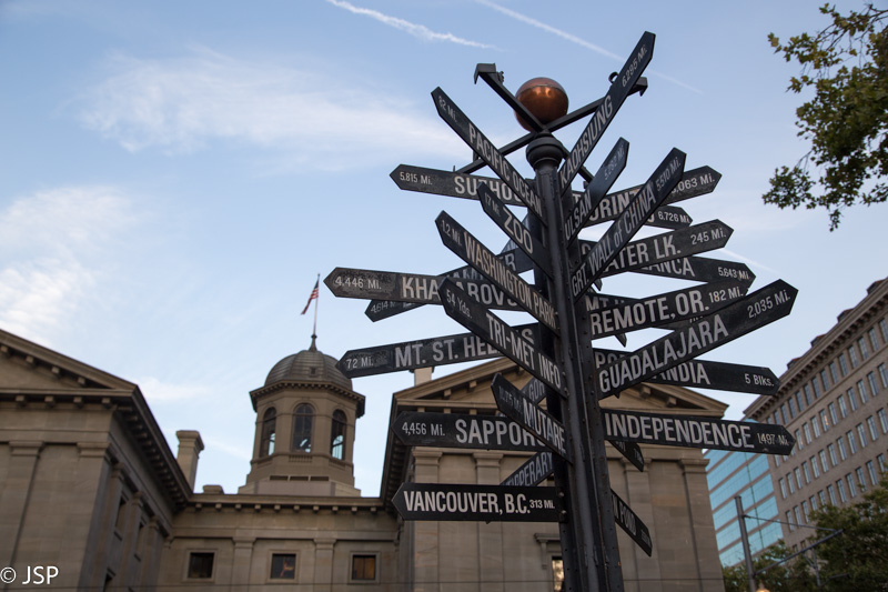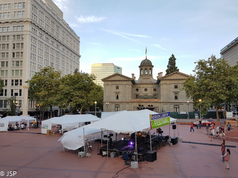 Po vakarienės einame apžiūrėti pagrindinę Portlando aikštę – Pioneer Courthouse Square. Aikštė mūsų nesužavi – tipiška amerikietiško didmiesčio erdvė. Labiausiai įsiminė stulpas su rodyklėmis į visas pasaulio puses.