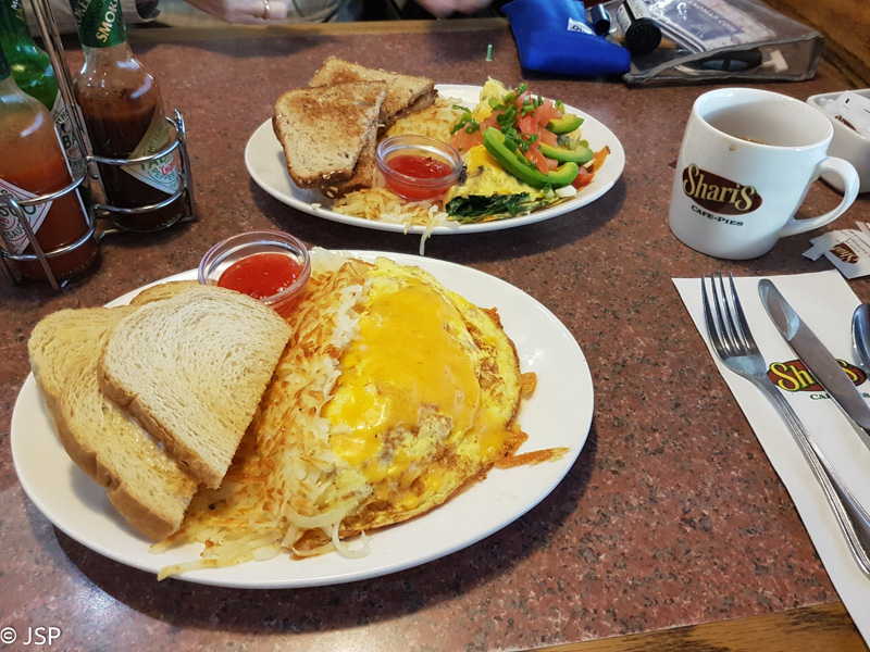 Kitą rytą prabundame tuoj po keturių. Oi tas laiko skirtumas, kaip sunku pirmas dienas prie jo priprasti! Kita vertus, visai gerai anksčiau pradėti dieną. Pusę septynių jau sėdime mašinoje. Pirmas sustojimas – sotūs ir skanūs pusryčiai Shari’s kavinėje, tuoj už miesto ribos. Porcijos amerikietiško dydžio, o kavos gali gerti kiek nori, padavėja vis siūlo papildyti puodelio turinį.
