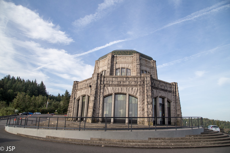 Kitas sustojimas – Vista House (“Namas su vaizdu”). Art nouveau stiliaus heksagono formos pastatas su didžiuliais stikliniais langas pastatytas 1918 m., čia yra muziejus ir suvenyrų parduotuvė, bet šį ankstyvą rytą viskas dar uždaryta.