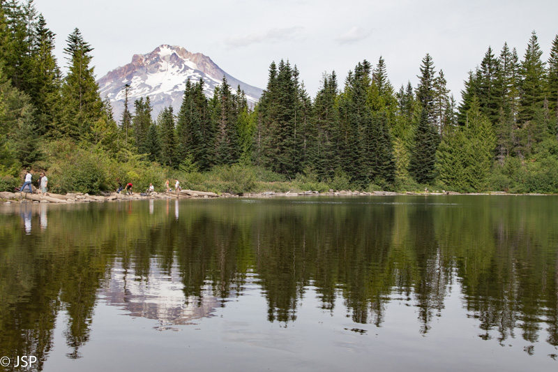 Po dviejų valandų, jau pravažiavę Hood kalną (kurio taip dorai ir nepamatėme), pasiekiame Mirror Lake trasos pradžią. Ši trasa labai populiari, nes prasideda prie pat kelio (beveik visos kitos trasos Mount Hood regione pasiekiamos tik duobėtais žvyrkeliais). Takas kyla aukštyn tankiu mišku, vaizdų lygiai nulis – imu galvoti, kad kažkaip ne taip suplanavau šią popietę ir kad gal išvis nevertėjo važiuoti pro Mount Hood. Galiausiai prieiname nedidelį neišvaizdų ežerą krūmais apžėlusiais krantais. Jau beveik pikti einame pelkėtoje pakrantėje nutiestu lentiniu taku – tik staiga medžiai baigiasi ir properšoje pamatome lygiame kaip stiklas ežero vandenyje atsispindintį Hood ugnikalnį. Piktumas ir nuovargis akimirksniu išgaruoja, o dar po akimirkos pradedame juoktis, kai prisimename, kad planuodami kelionę būtent dėl šio vaizdo ir pasirinkome Mirror Lake trasą, tik paskui kažkaip sugebėjome apie tai pamiršti! Gerai, kad trasa žiedinė, nes kitaip būtume gal net ir nėję aplink ežerą.