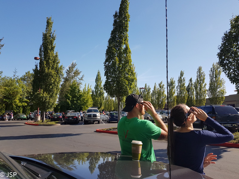 Kita diena – rugpjūčio 21-oji, ypatinga tuo, kad dešimtą ryto įvyks pilnas saulės užtemimas. Po ilgų debatų užtemimui stebėti pasirinkome už 50 kilometrų į pietus nuo Portlando esantį Woodburn Premium Outlet. Šis prekybos centras yra visai šalia interstate greitkelio, lengvai pasiekiamas iš Portlando ir turi nemažą parkingą. Užtemimui pasibaigus prognozuojami didžiuliai transporto kamščiai, o mums vakare reikia skristi į Aliaską, tad įstrigti kamščiuose mes negalime sau leisti. Woodburn yra užtemimo juostos pakraštyje (užtemimas čia truks beveik perpus trumpiau nei juostos centre), taigi tikimės, kad ir žmonių gal bus mažiau ir jei po užtemimo iškart išvažiuosime, turėtume išvengti kamščių ir laiku grįžti į Portlandą. Penktą ryto išvažiavę iš viešbučio, tuoj po šešių pasiekiame Woodburn. Dar tamsu, iki užtemimo dar keturios valandos, bet mašinų parkinge jau nemažai. “The eclipse?”, pasitikrina reindžerė prie įvažiavimo – lyg būtų dar kokia kita priežastis šeštą ryto atvažiuoti į prekybcentrį. Parkingas užtemimo proga kainuos 20 dolerių (šiaip nekainuoja nieko). Prisiparkavę netoli išvažiavimo, einame ieškoti pusryčių. Vienintelė šį ankstyvą rytą dirbanti kavinė – pilnutėlė, eilėje laukiame daugiau kaip pusvalandį. Po aštuonių atsidaro ir kai kurios parduotuvės, tad rytas praeina greičiau nei tikėjomės. Apie pusę dešimtos prasideda dalinis saulės užtemimas.