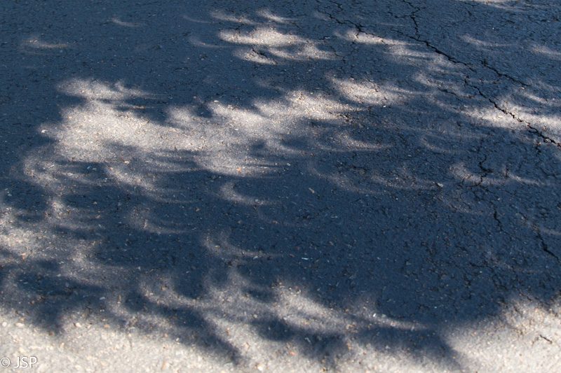 Žmonės būriuojasi parkinge, sėdi ant suoliukų ir atsineštų kėdučių ant šaligatvių prie parduotuvių ir pro specialius akinius stebi vis mažėjantį saulės diską. Draugiški kaimynai parkinge ir mums trumpam paskolina savo akinius, bet žiūrėti kol kas nelabai yra į ką – pjautuvo formos saulės diskas nėra toks jau įspūdingas. Gerokai įdomesnis dalinio užtemimo efektas – medžių lapų metami šešėliai, iš apvalių tapę pjautuvo formos. Niekad dar nebuvau mačiusi tokio reiškinio!