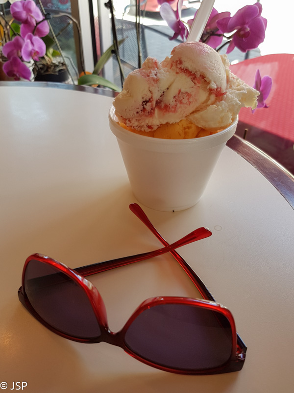 Kai nusibosta vaikščioti po parką ir sėdinėti ant suoliukų, vėl sėdame į mašiną ir grįžtame į Vancouverį. Diena labai karšta, gerokai virš 30, tad pakrantės gatvelėje užmatę ledainę susigundome ir užeiname vidun atsivėsinti. Užsisakome du kaušelius ledų; kai pamatome, kokio dydžio tie kaušeliai, suprantame, kad su kaupu būtų užtekę ir vieno, bet apsigalvoti jau per vėlu. Ledai labai skanūs, bet visos porcijos niekaip neįveikiame.