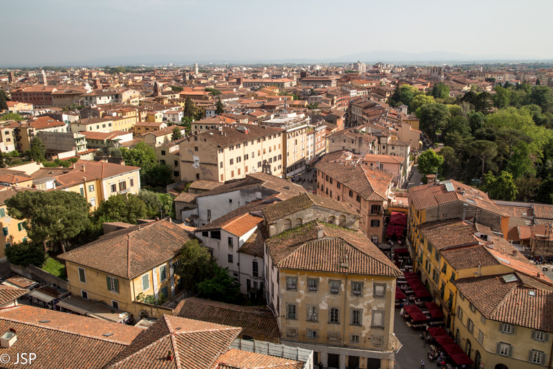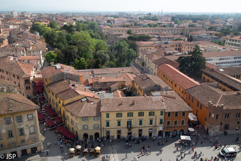 Viršuje – platūs vaizdai į Stebuklų aikštę, Pizos senamiestį ir netolimus kalnus.