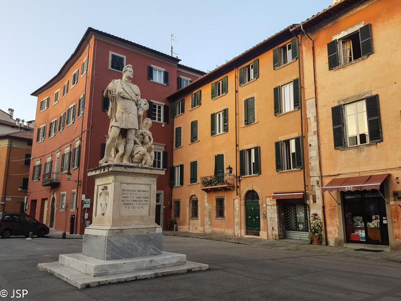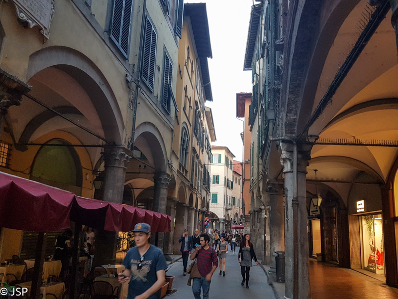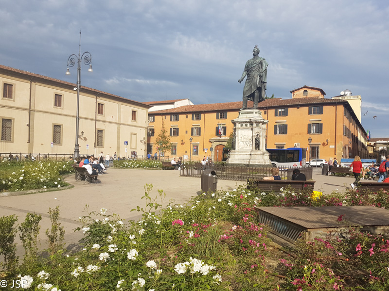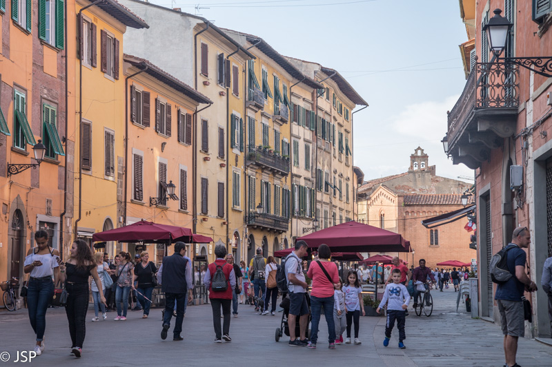 Prieiname Ponte di Mezzo. Šiuo tiltu mums reikėtų pereiti į kitą krantą ir sukti link stoties, bet dar nesinori. Prie pat tilto – kavinių šurmulio pilna nedidelė Garibaldi aikštė, jos kampuose prasideda kelios mažos gatvelės, vedančios į senamiesčio labirintą. Susigundome kiek paėjėti tolyn ir atrandame dar vieną jaukų Pizos kvartalą su siaurutėmis gatvelėmis, vietomis vos ne virš galvos susieinančiais pastatų stogais, spalvingomis parduotuvėlėmis, jaukiomis kelių staliukų kavinukėmis. Čia pilna jaunatviško šurmulio – Pizos universiteto studentai, panašu, pramogauja būtent šiame kvartale. Ir mums čia patinka gerokai labiau nei šalia Stebuklų aikštės esančiose gatvėse, kur viskas skirta turistams. Šiame kvartale turbūt ir pavalgę būtume skaniau. Gaila, kad nebeturime laiko ilgiau paklaidžioti (nenorime susivėlinti grįžti į Florenciją), bet džiaugiamės, kad netyčia čia užsukome.