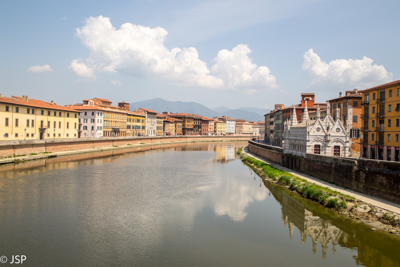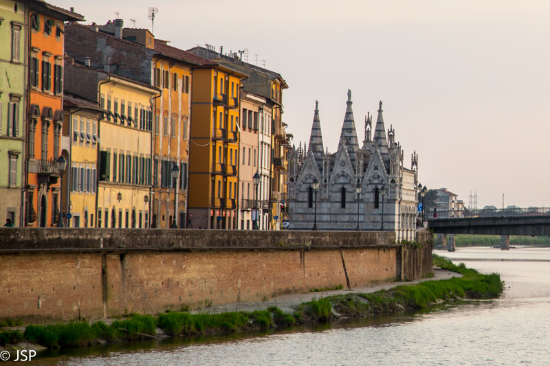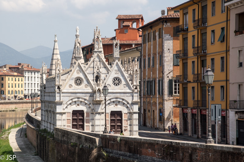 Pusę dviejų jau lipame iš traukinio Pizoje. Čia karšta, daug karščiau negu Florencijoje, nors ir ten šilumos trūkumu nesiskundėme. Pasikonsultavę su maps.me programėle mobiliajame telefone, pėsčiomis einame iki Piazza dei Miracoli – garsiausios ir labiausiai turistų lankomos Pizos aikštės. Pakeliui dar norime pamatyti Santa Maria della Spina – mažutę bažnytėlę Arno upės pakrantėje. Būtent ją, o ne pasvirusį bokštą, aš ryškiausiai prisimenu iš anos viešnagės Pizoje. Siauros gatvelės netrukus išveda mus prie upės, ir štai ji – Santa Maria della Spina, tokia mažutė, kad ir bažnyčia ją vadinti nelabai galima, greičiau jau koplyčia, bet dydžio trūkumą su kaupu atperka grakščios fasado linijos. Gaila tik, kad vidun pakliūti neįmanoma.