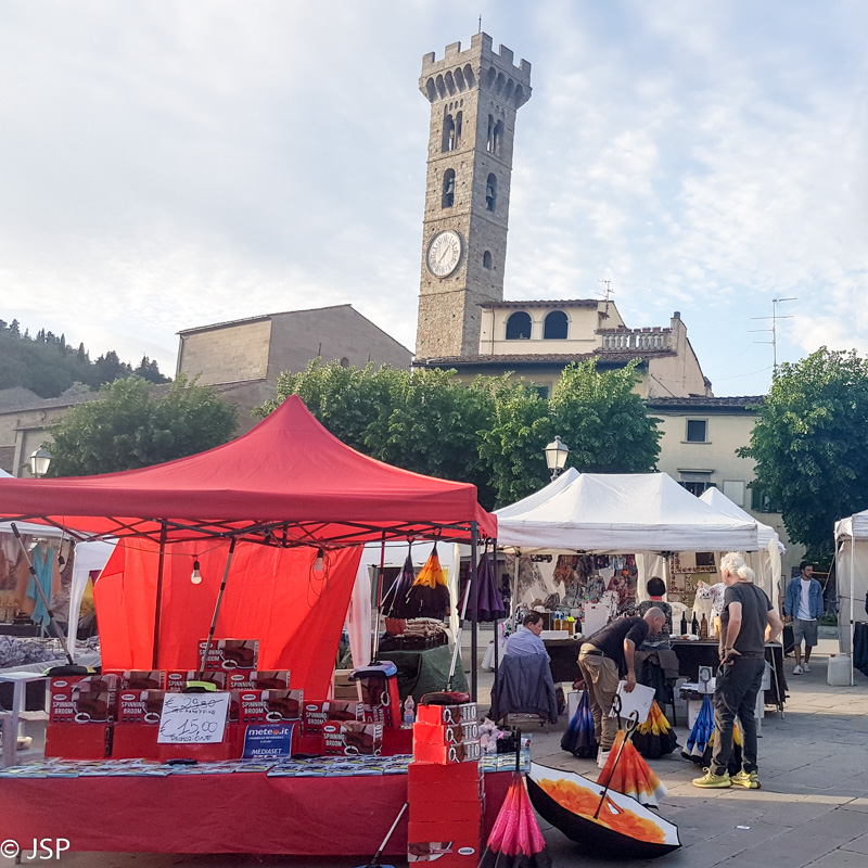 Po gero pusvalandžio ir daugybės sustojimų išlipame iš autobuso Fiesolės pagrindinėje aikštėje. Miestelis mažas ir labai jaukus, o kad bus gražių vaizdų, buvo aišku jau važiuojant autobusu, kai kilome vis aukštyn ir aukštyn į kalvą. Aikštėje vyksta mugė – galima padegustuoti įvairius maisto produktus, amatininkai pardavinėja savo gaminius, dailininkai čia pat tapo norinčiųjų portertus (norinčių, tiesa, nedaug). Tvyro jaukus šurmulys.