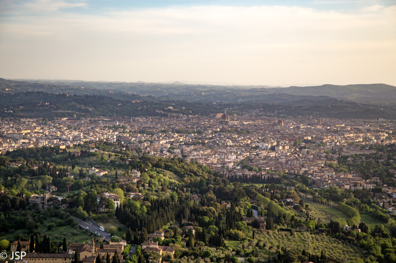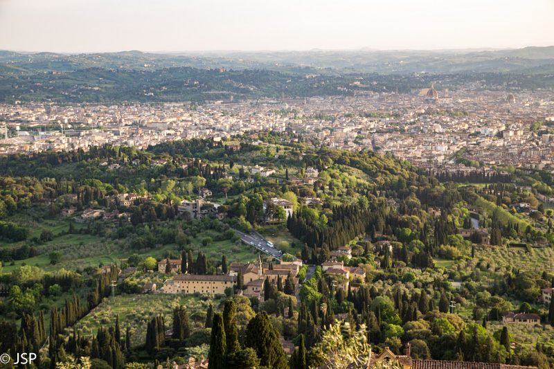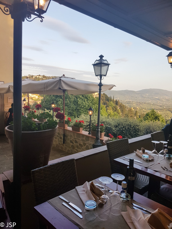 Porą valandų pailsėję, vėl ruošiamės į miestą. Šiandien mano gimtadienis, ta proga numatyta šventinė vakarienė Fiesolėje. Interneto platybėse radau gerų atsiliepimų apie La Reggia degli Etruschi restoraną, garsėjantį puikiais vaizdais nuo terasos ir labai skaniais desertais; ten ir užsakėme staliuką vakarienei. Kažkada buvusi etruskų tvirtovė, vėliau – Florencijos aristokratų vasaros rezidencija, Fiesolė yra vos už 8 kilometrų nuo Florencijos, aukštai Toskanos kalvose. Nuo miestelį juosiančių akmeninių sienų atsiveria platūs vaizdai į slėnį ir į Florenciją. Fiesolė lengvai pasiekiama autobusu iš Piazza San Marco, kelionė trunka apie pusvalandį, autobusai važiuoja kas 15-20 minučių.