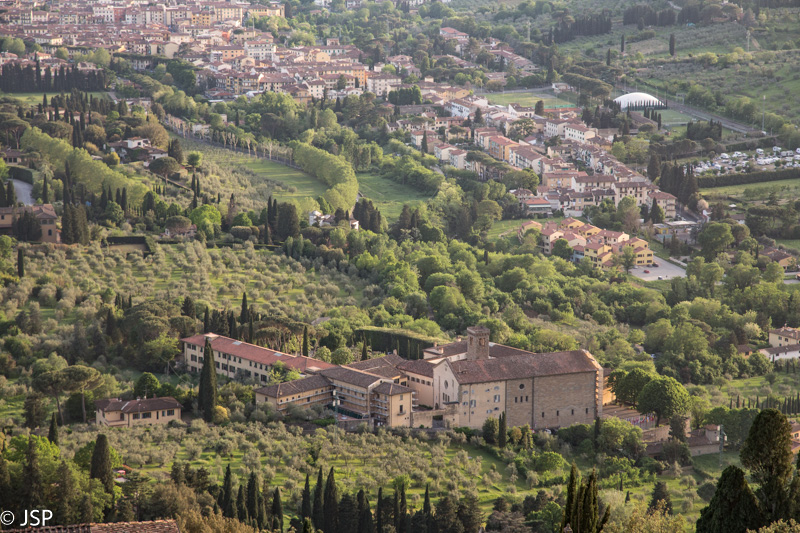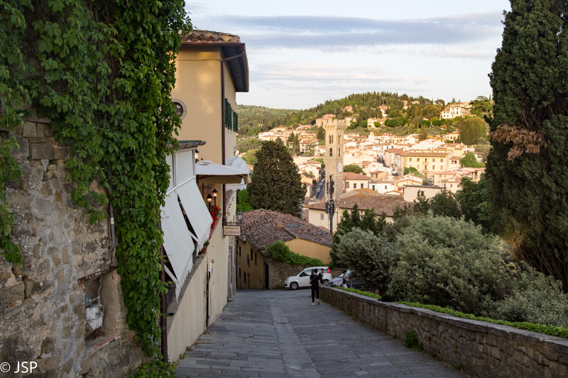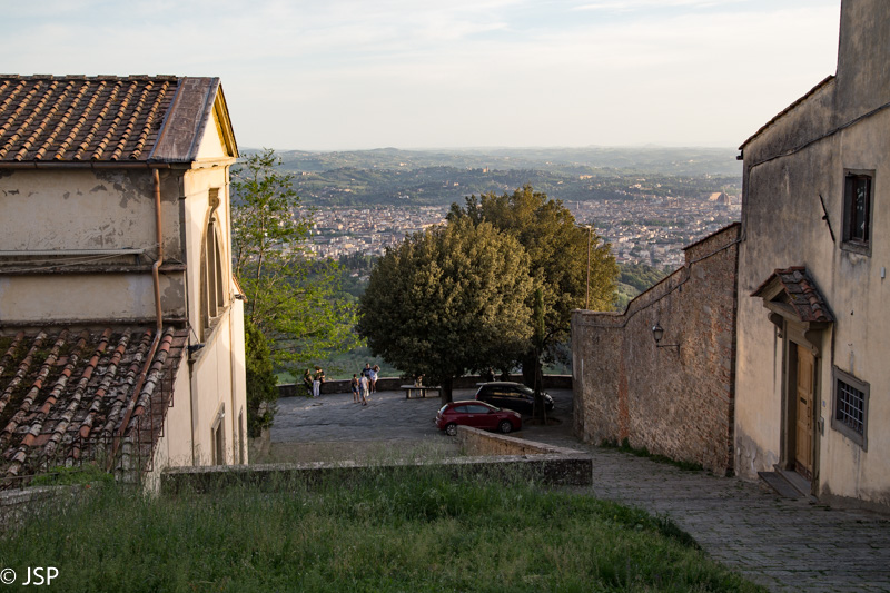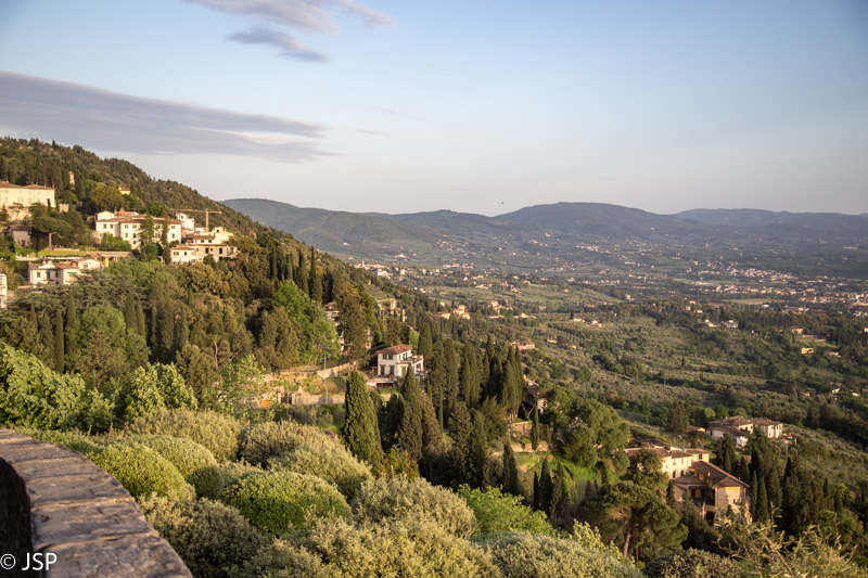Iki vakarienės dar turime pusvalandį, tad einame į pačiame miestelio pakraštyje esančią apžvalgos aikštelę. Čia dar išlikę kadaise miestelį juosusios gynybinės sienos fragmentai; vaizdai gi verti ne vieno milijono. Žalios Toskanos kalvos, kiparisų alėjos, rusvų čerpių stogai, šiltos vakaro spalvos – labai labai gražu. Toli slėnio gilumoje – vos įžiūrimi vakaro miglos apgaubti Florencijos bokštai.