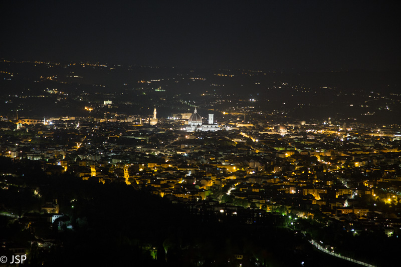 Kol pavakarieniaujame, lauke visai sutemsta. Išėję dar pasižvalgome į apačioje plytinčią naktinę Florencijos panoramą ir neskubėdami grįžtame į centrinę aikštę, kur netrukus atvažiuoja autobusas, parvešiantis mus į Florenciją.