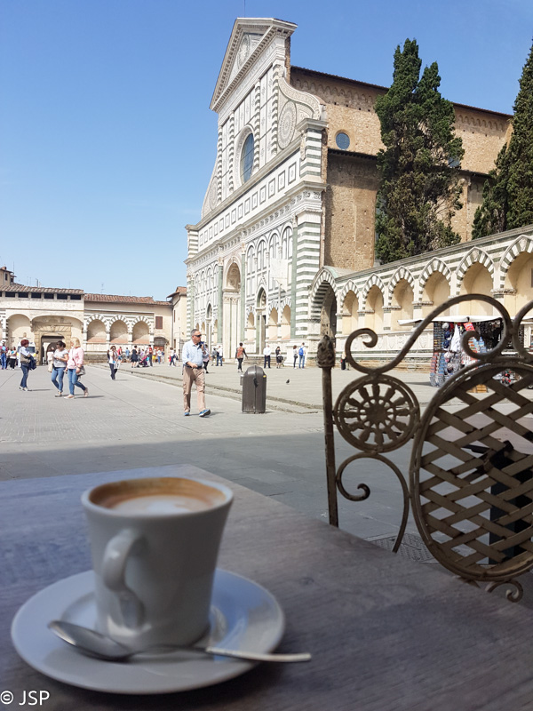 Rytą pradedame tingiais vėlyvais pusryčiais ir jau po dešimtos pagaliau išsikrapštome iš apartamentų į lauką. Jau pažįstamomis gatvėmis ir paupio parko takais neskubėdami einame link senojo Florencijos centro ir sukame link Santa Maria Novella bažnyčios. Pasigėrėję bažnyčios fasadu ir trumpam užsukę vidun, prisėdame vienoje iš aikštę juosiančių kavinukių. Kapučino puodelis su vaizdu į Santa Maria Novella – puikus florentietiško ryto akcentas.