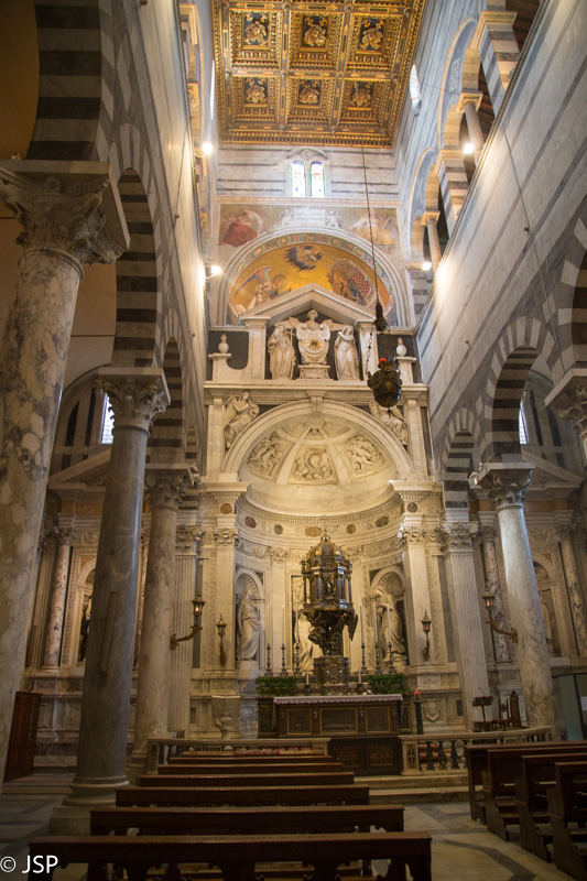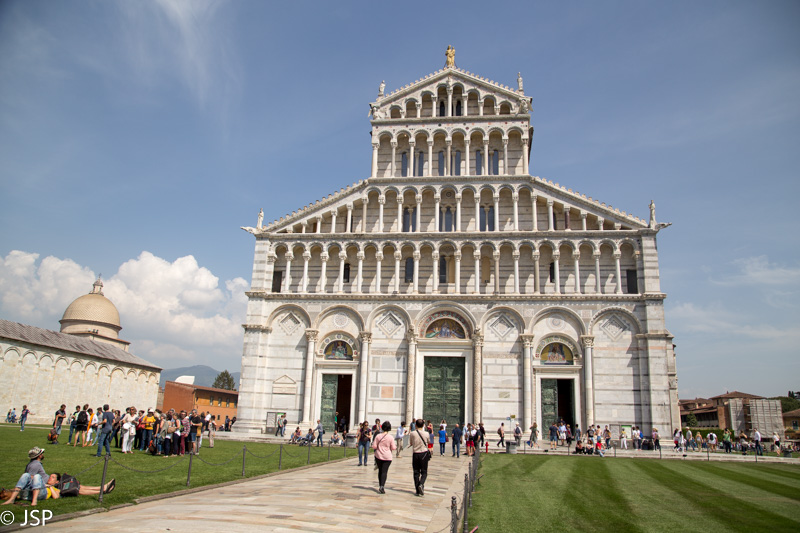 Stebuklų aikštėje tvyro alsus drėgnas karštis. Apėję aikštės perimetrą, lendame į katedrą atsivėsinti. Romaninio stiliaus fasadas viduje slepia didžiulį skulptūrų, raižinių, paveikslų ir freskų lobyną. Katedra buvo pradėta statyti XI a. pabaigoje, darbai truko beveik šimtmetį, turtingi Pizos pirkliai buvo pasiryžę nepasiduoti kaimyninei Venecijos respublikai ir pastatyti nė kiek ne blogesnę, o jei pavyks, tai ir įspūdingesnę katedrą.