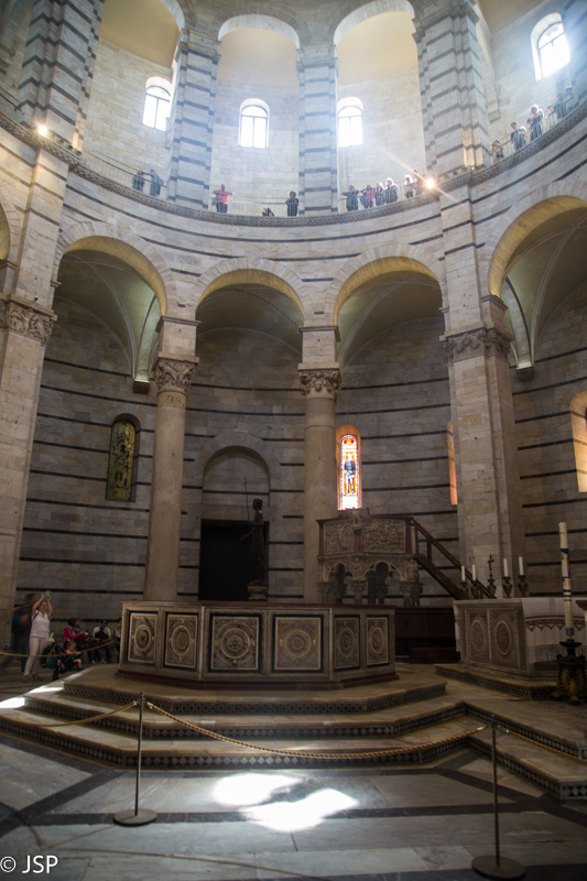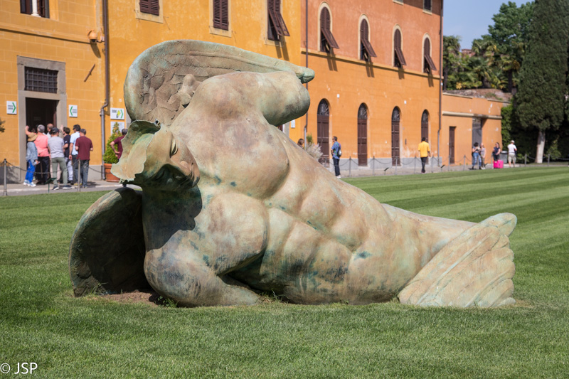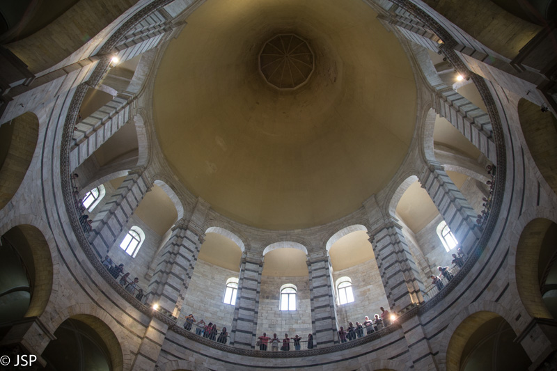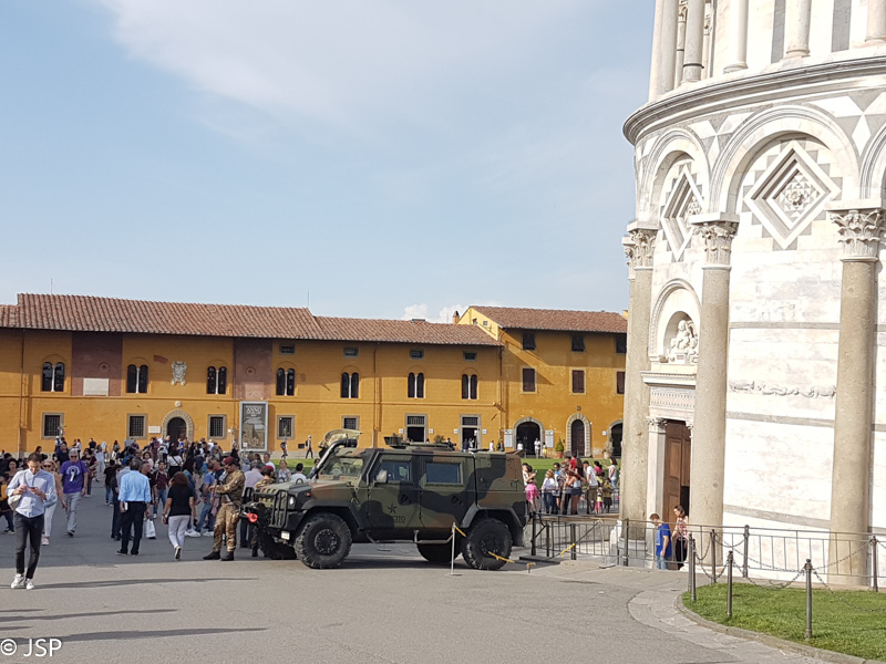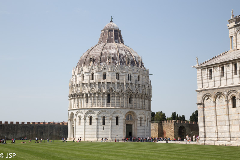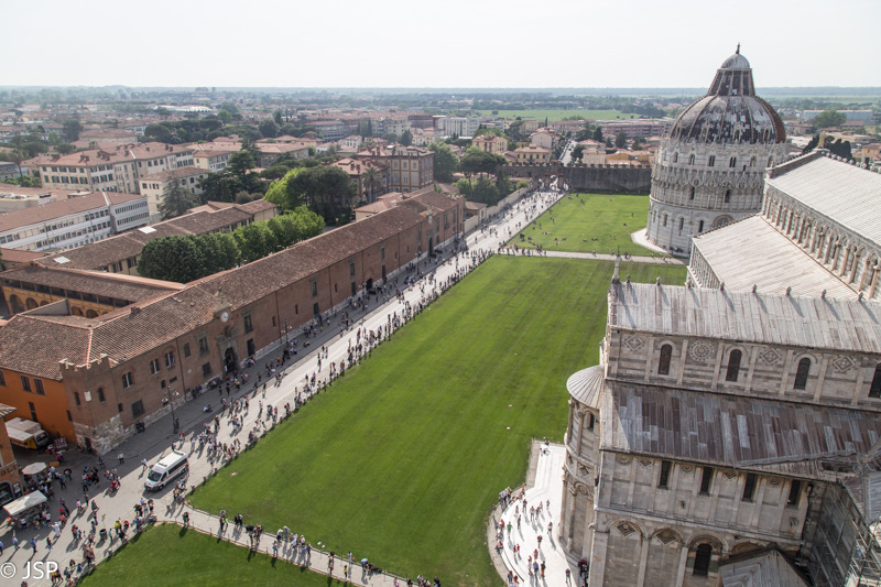 Netrukus pasiekiame Stebuklų aikštę ir įsimaišome į čia šurmuliuojančią minią. Žmonių labai daug, kaip jau įprasta tokiose vietose. Populiariausia atrakcija – fotografuotis svyrančio bokšto fone, bandant jį prilaikyti abiem rankom. Bokštas, beje, kiek patiesintas po daug metų trukusių gelbėjimo darbų ir dabar laikomas saugiu, netgi į viršų kopti vėl leidžiama. Bilietus nusipirkome iš vakaro internetu (perkant paskutinę minutę daug šansų, kad liksite kaip musę kandę, ypač savaitgalį). Bilietų yra įvairių, mes pasirinkome kompleksinį, leidžiantį aplankyti dar ir krikštyklą bei Campo Santo kapines. (Įėjimas į katedrą nemokamas, bet bilietą vis tiek reikia turėti – dar viena itališka keistenybė.)