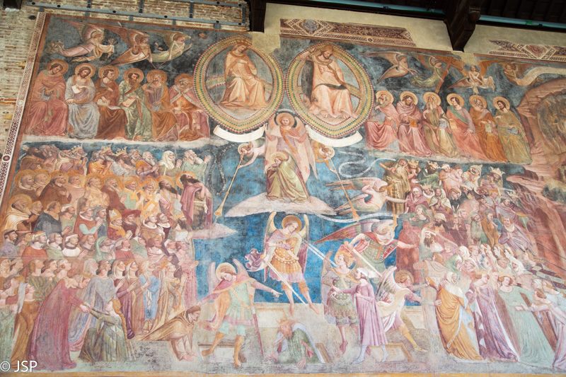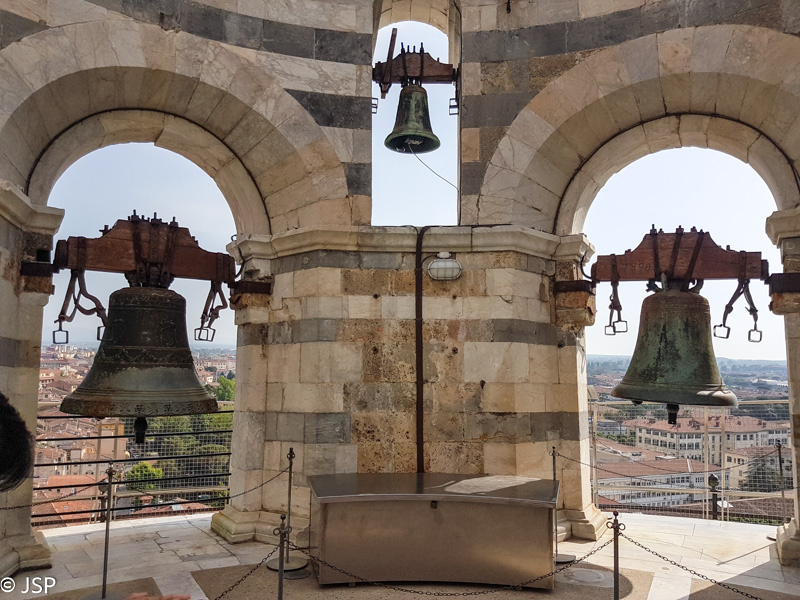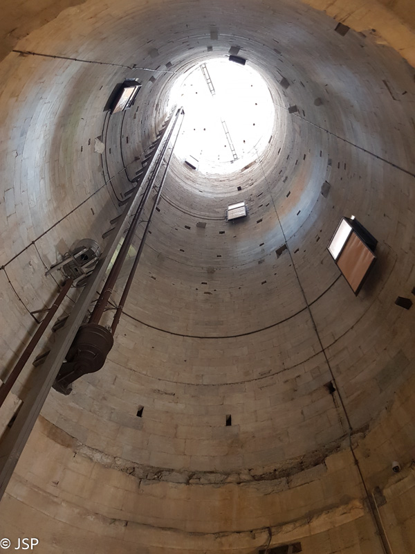 Atstovėje neilgą elę ir praėję patikrą, netrukus jau žengiame į bokšto vidų. Bokštą stabilizuojanti konstrukcija atrodo gana įspūdingai (pirma mintis buvo, kad tai liftas). Iki aikštelės bokšto viršuje, po varpine – 296 laipteliai. Lipti nesunku, tik paskutinė atkarpa nėra labai maloni – marmuriniai laipteliai labai nudėvėti, įdubę, slidūs, tenka atidžiai sekti, kur koją statai.