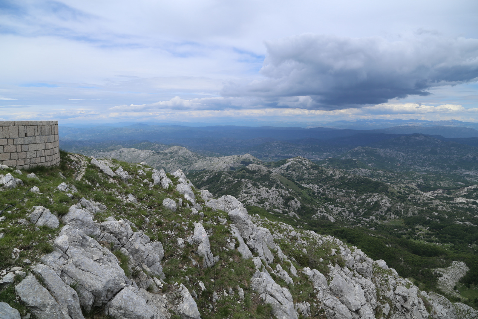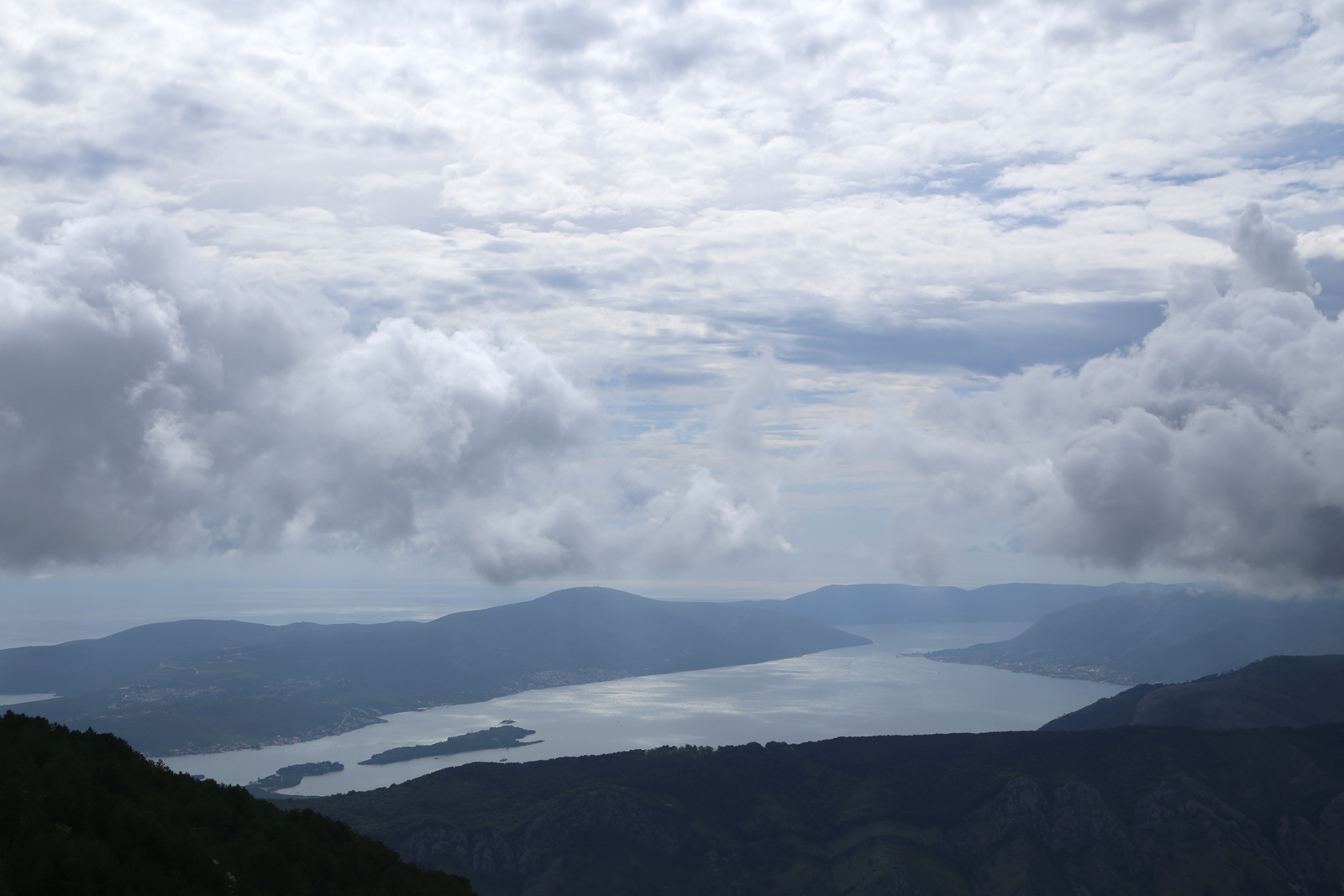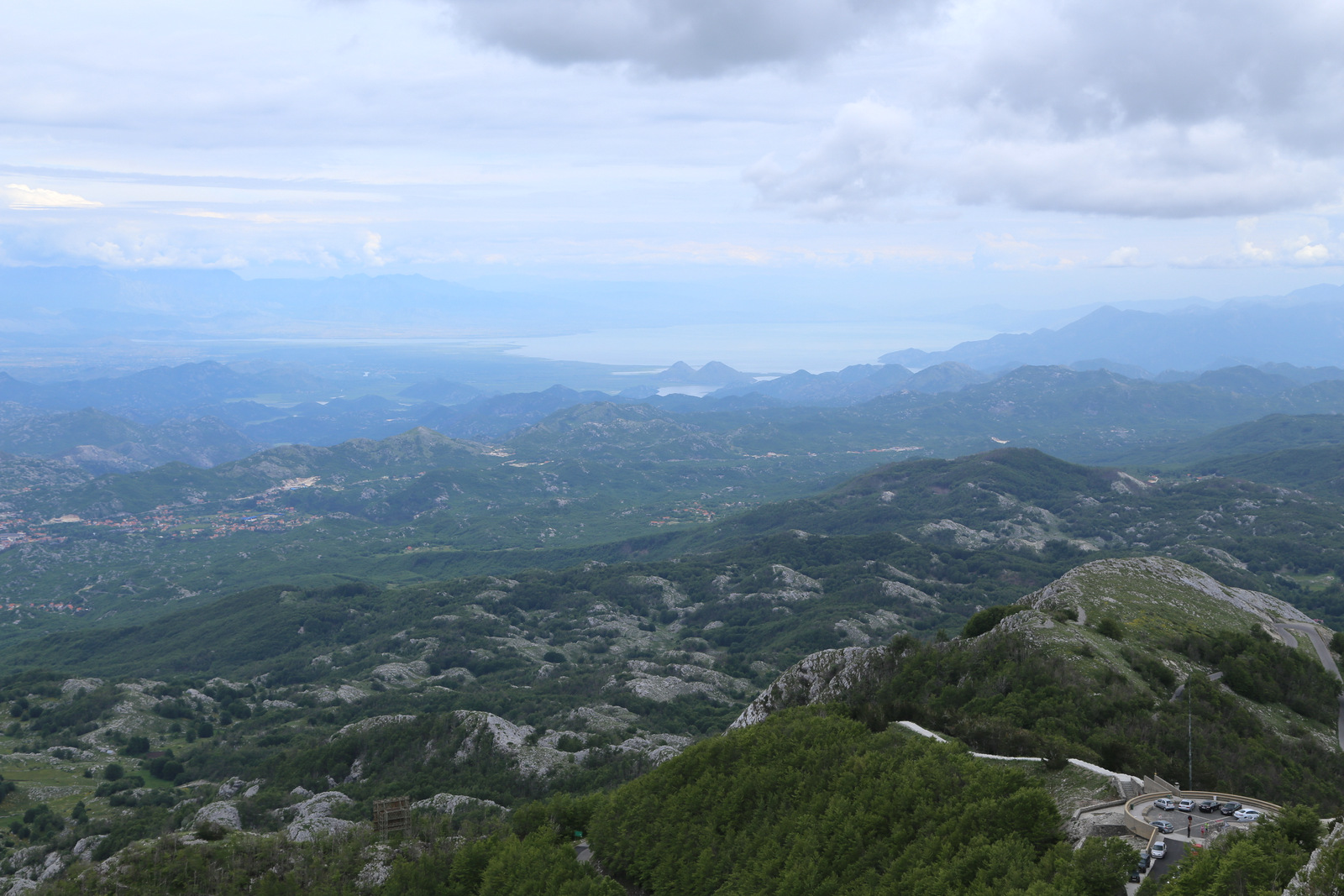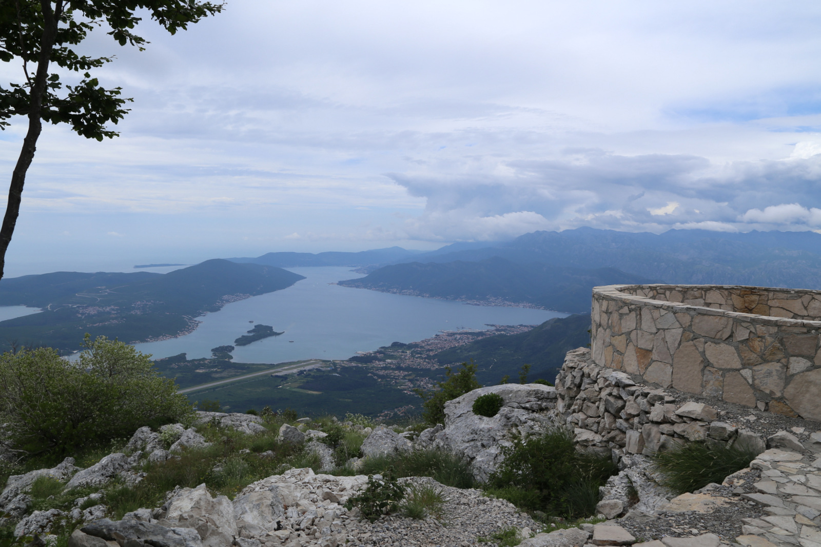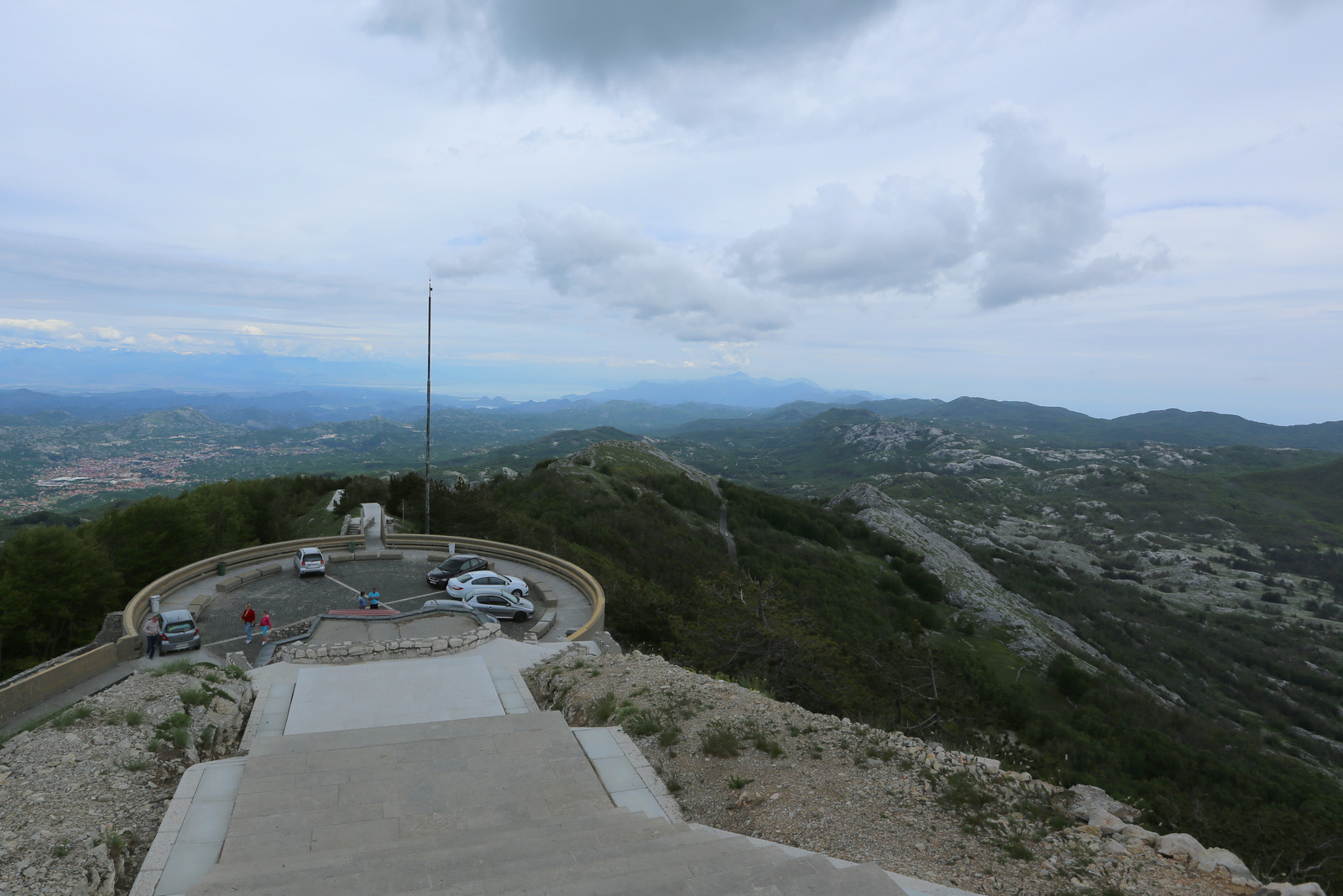 Gražią saulėtą dieną čia būtų tikrai puiku – šiandien, deja, aplink vyrauja pilka spalva, horizontas apsitraukęs rūku, matomumas prastas. Bet vis tiek įspūdinga. Net ir Kotoro įlankos gabaliukas matosi, ir Skadar ežeras kitoje pusėje. Po aikštelę plaikstosi rusų šeimyna, visaip vieni kitiems pozuoja, darosi nuotraukas įvairiais kampais, žentas mėgina įkalbėti uošvę atsisėsti ant akmeninės tvorelės, toji dievagojasi, kad numirs iš baimės, bet pagaliau ryžtasi, įtemptai šypsosi į fotoaparatą ir paskui sako, kad labai baisu buvo, bet ko nepadarysi dėl gero kadro. Jiems išėjus, liekam vieni, apsupti kalnų tylos ir padūmavusių tolių.