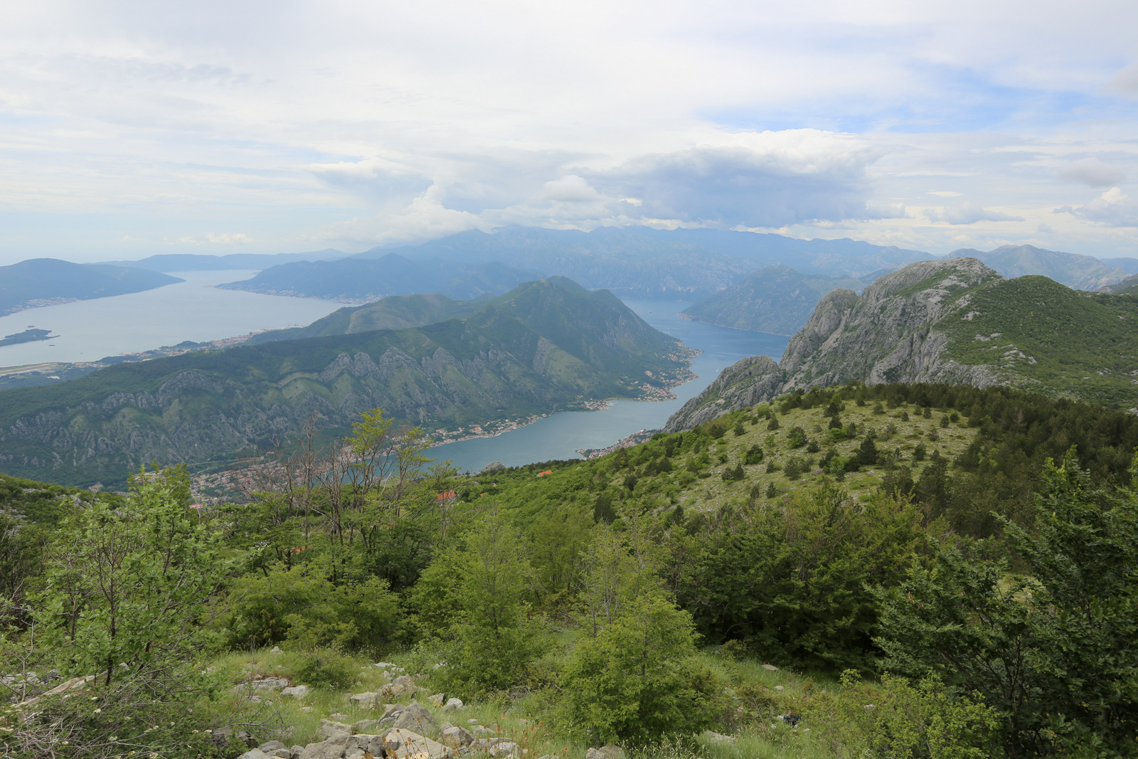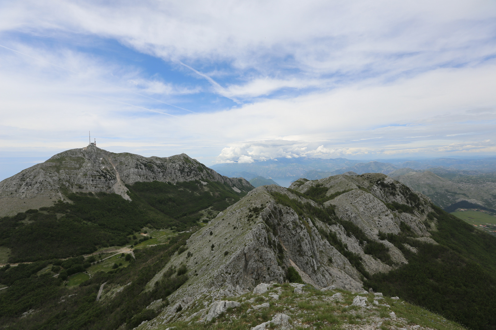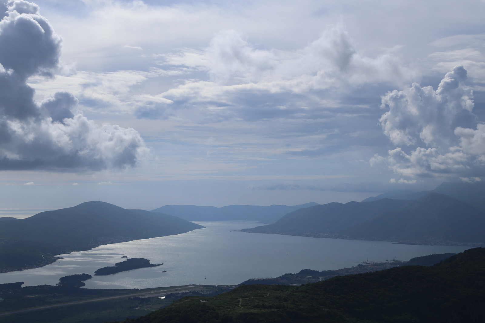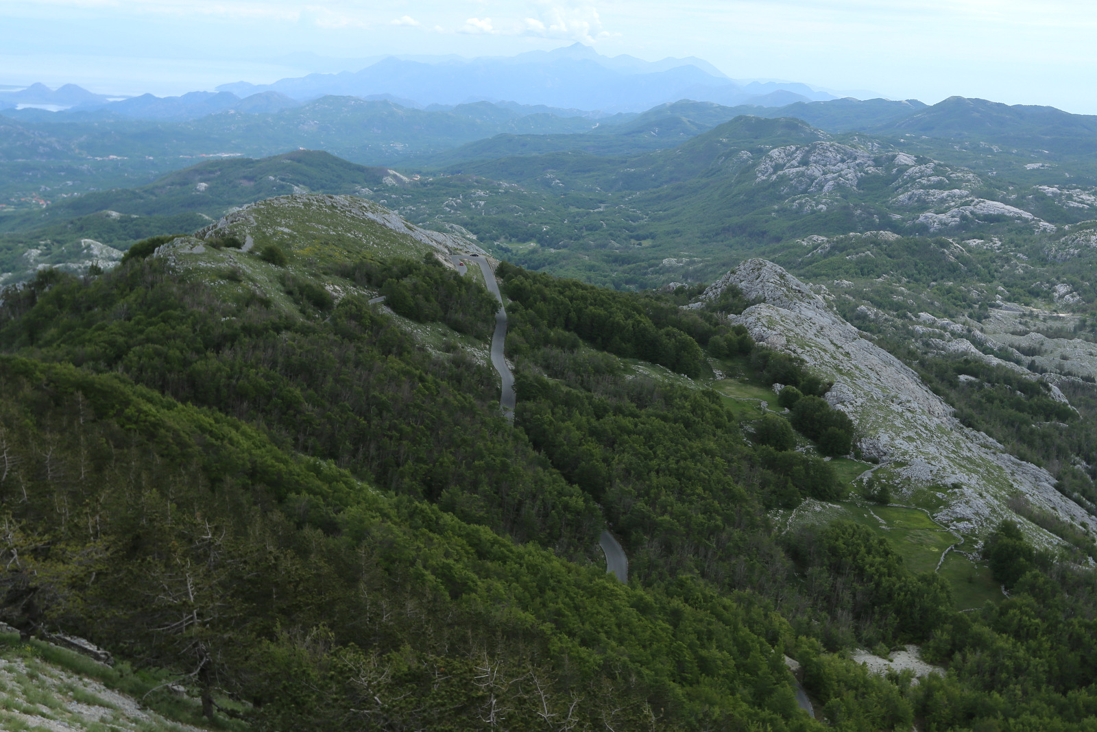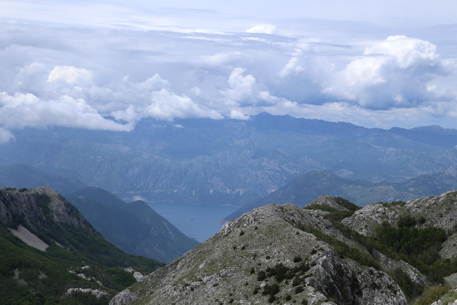 Gražią saulėtą dieną čia būtų tikrai puiku – šiandien, deja, aplink vyrauja pilka spalva, horizontas apsitraukęs rūku, matomumas prastas. Bet vis tiek įspūdinga. Net ir Kotoro įlankos gabaliukas matosi, ir Skadar ežeras kitoje pusėje. Po aikštelę plaikstosi rusų šeimyna, visaip vieni kitiems pozuoja, darosi nuotraukas įvairiais kampais, žentas mėgina įkalbėti uošvę atsisėsti ant akmeninės tvorelės, toji dievagojasi, kad numirs iš baimės, bet pagaliau ryžtasi, įtemptai šypsosi į fotoaparatą ir paskui sako, kad labai baisu buvo, bet ko nepadarysi dėl gero kadro. Jiems išėjus, liekam vieni, apsupti kalnų tylos ir padūmavusių tolių.