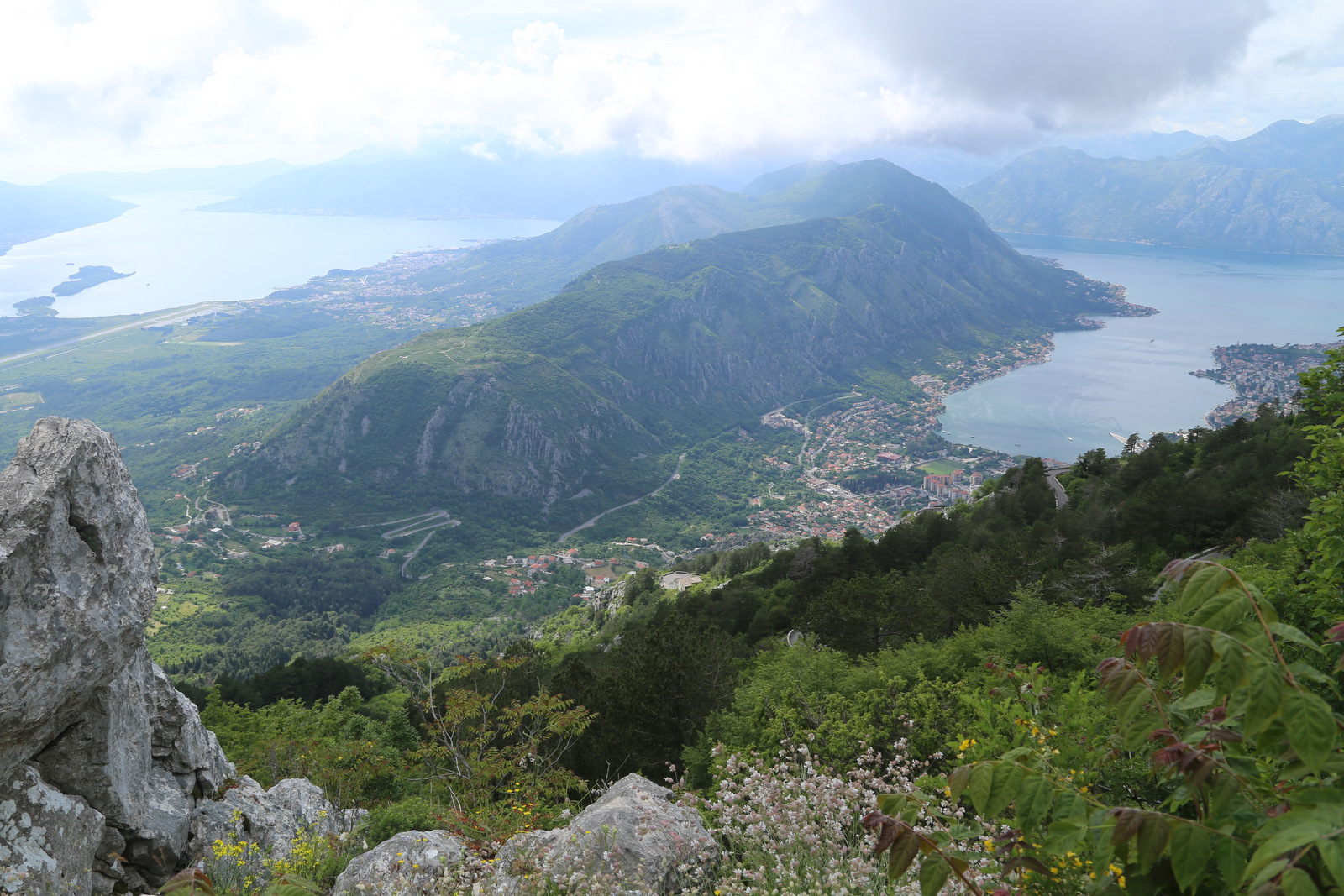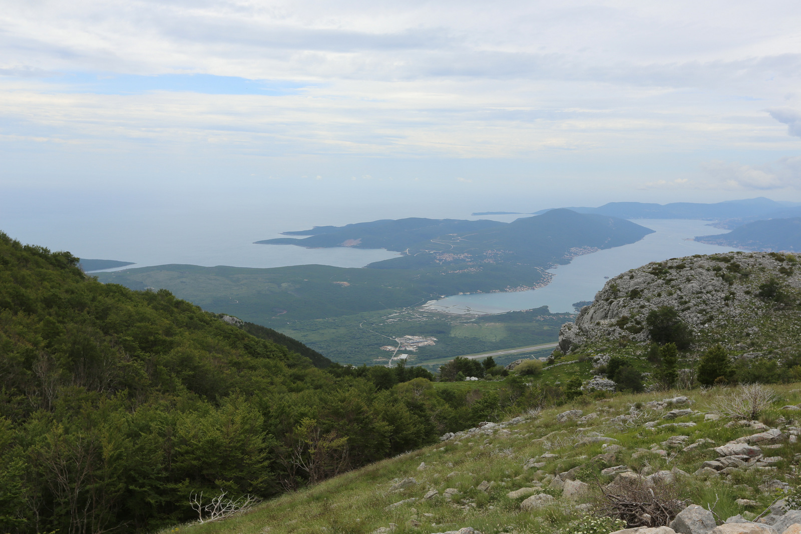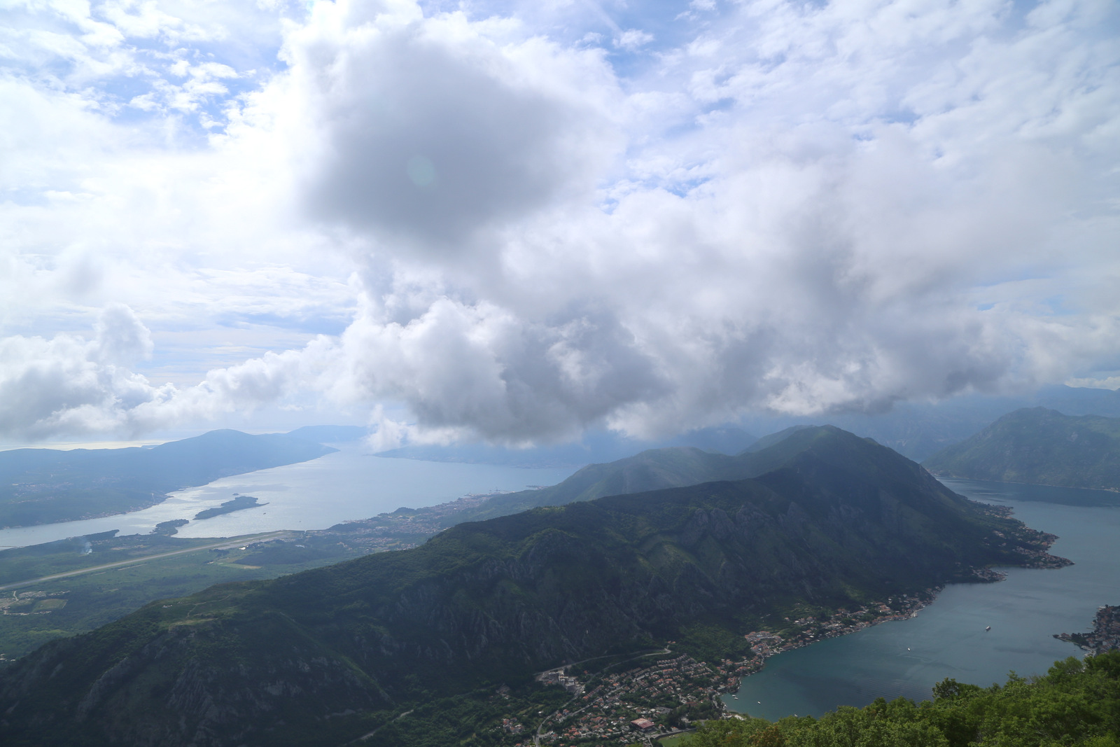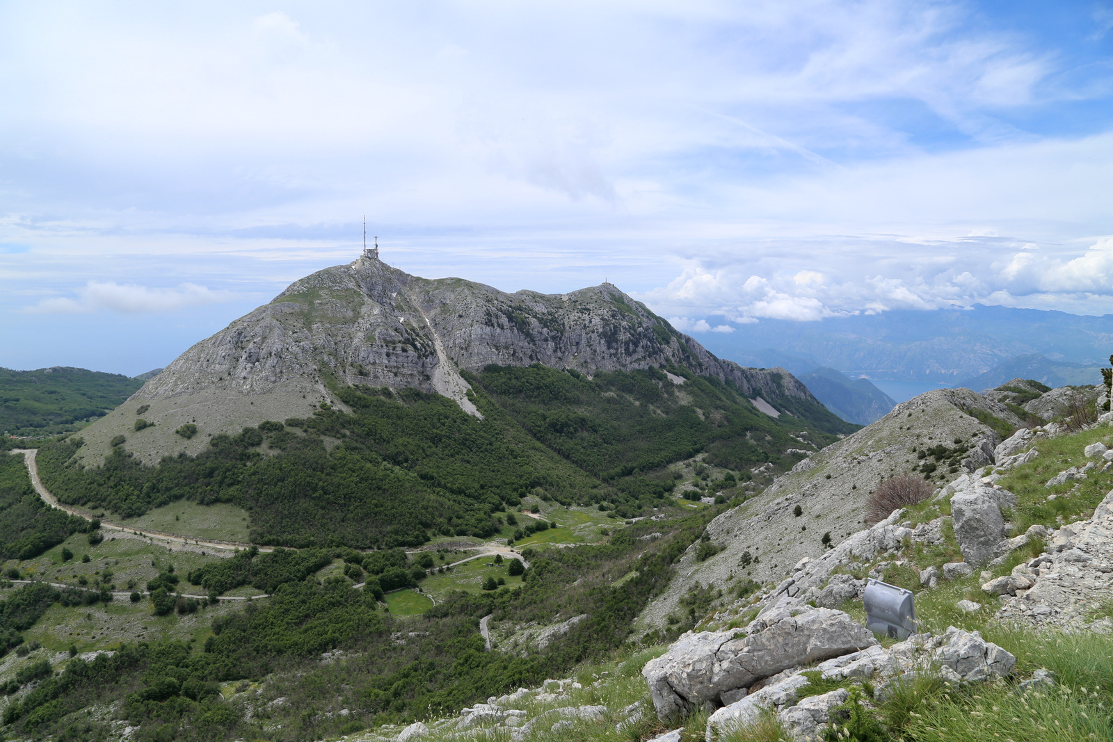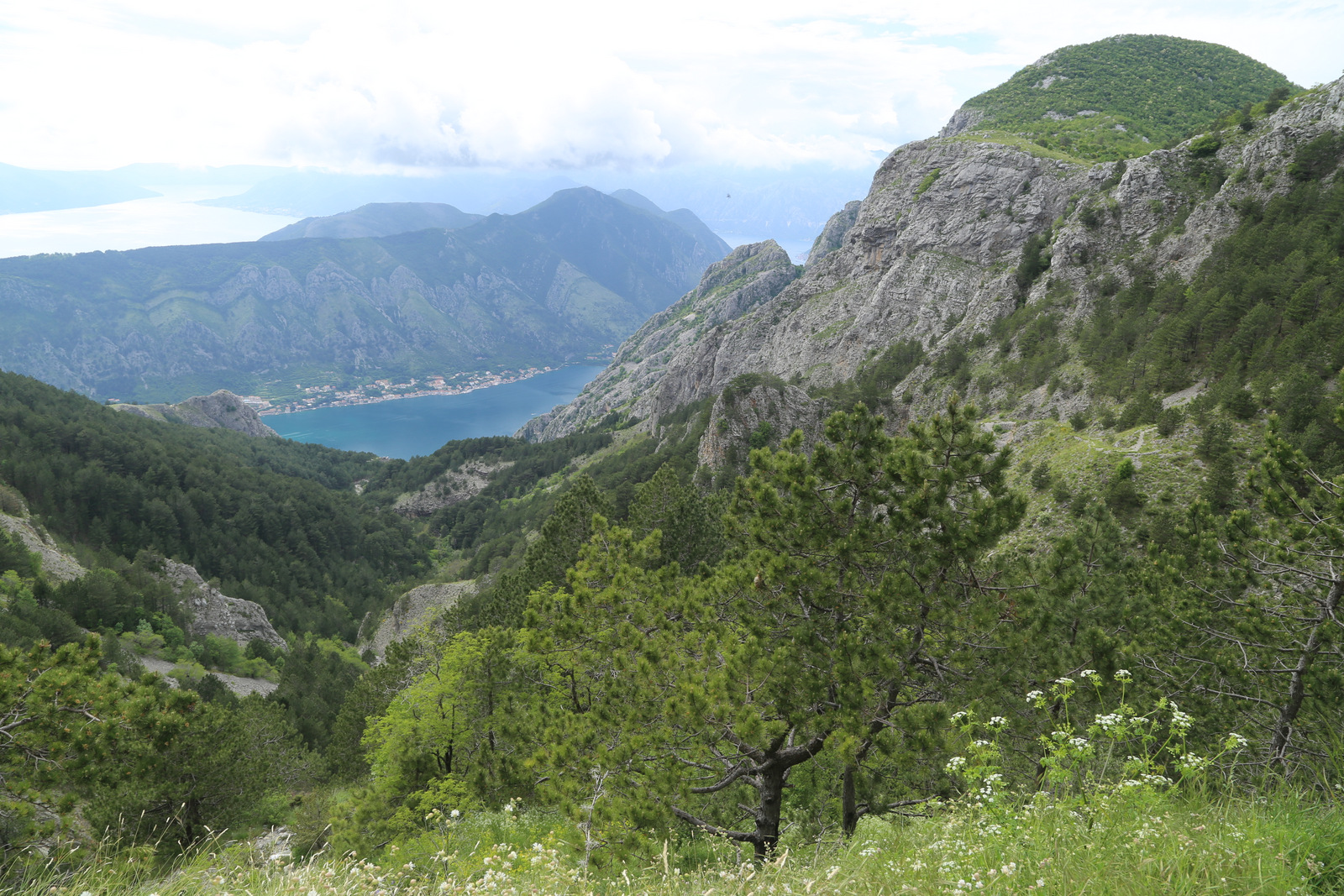 Gražią saulėtą dieną čia būtų tikrai puiku – šiandien, deja, aplink vyrauja pilka spalva, horizontas apsitraukęs rūku, matomumas prastas. Bet vis tiek įspūdinga. Net ir Kotoro įlankos gabaliukas matosi, ir Skadar ežeras kitoje pusėje. Po aikštelę plaikstosi rusų šeimyna, visaip vieni kitiems pozuoja, darosi nuotraukas įvairiais kampais, žentas mėgina įkalbėti uošvę atsisėsti ant akmeninės tvorelės, toji dievagojasi, kad numirs iš baimės, bet pagaliau ryžtasi, įtemptai šypsosi į fotoaparatą ir paskui sako, kad labai baisu buvo, bet ko nepadarysi dėl gero kadro. Jiems išėjus, liekam vieni, apsupti kalnų tylos ir padūmavusių tolių.