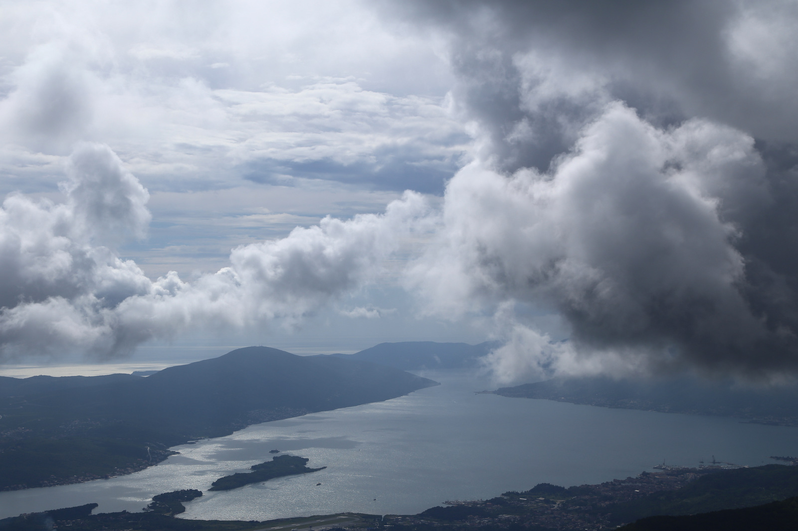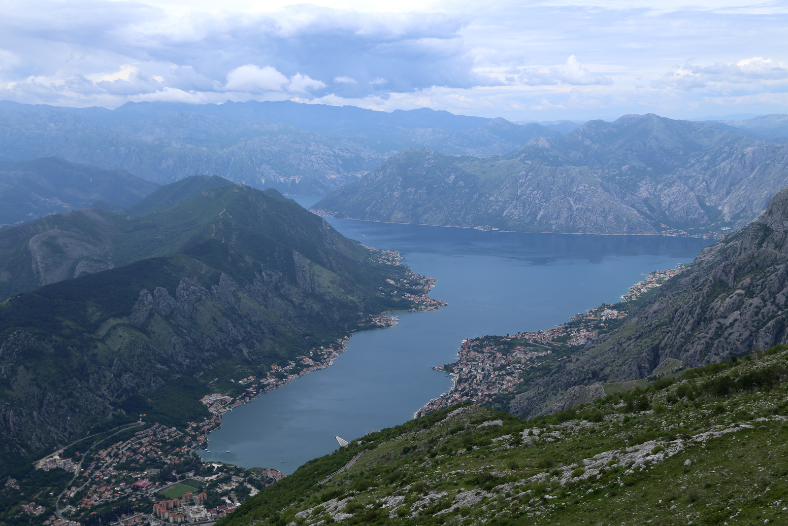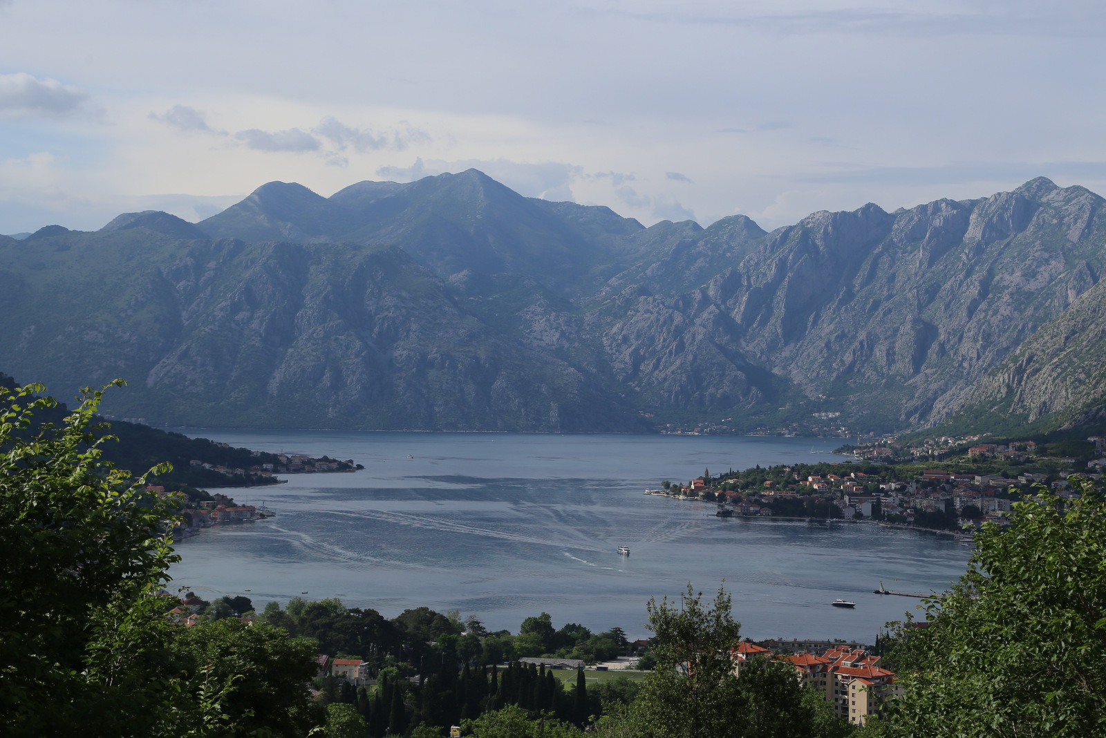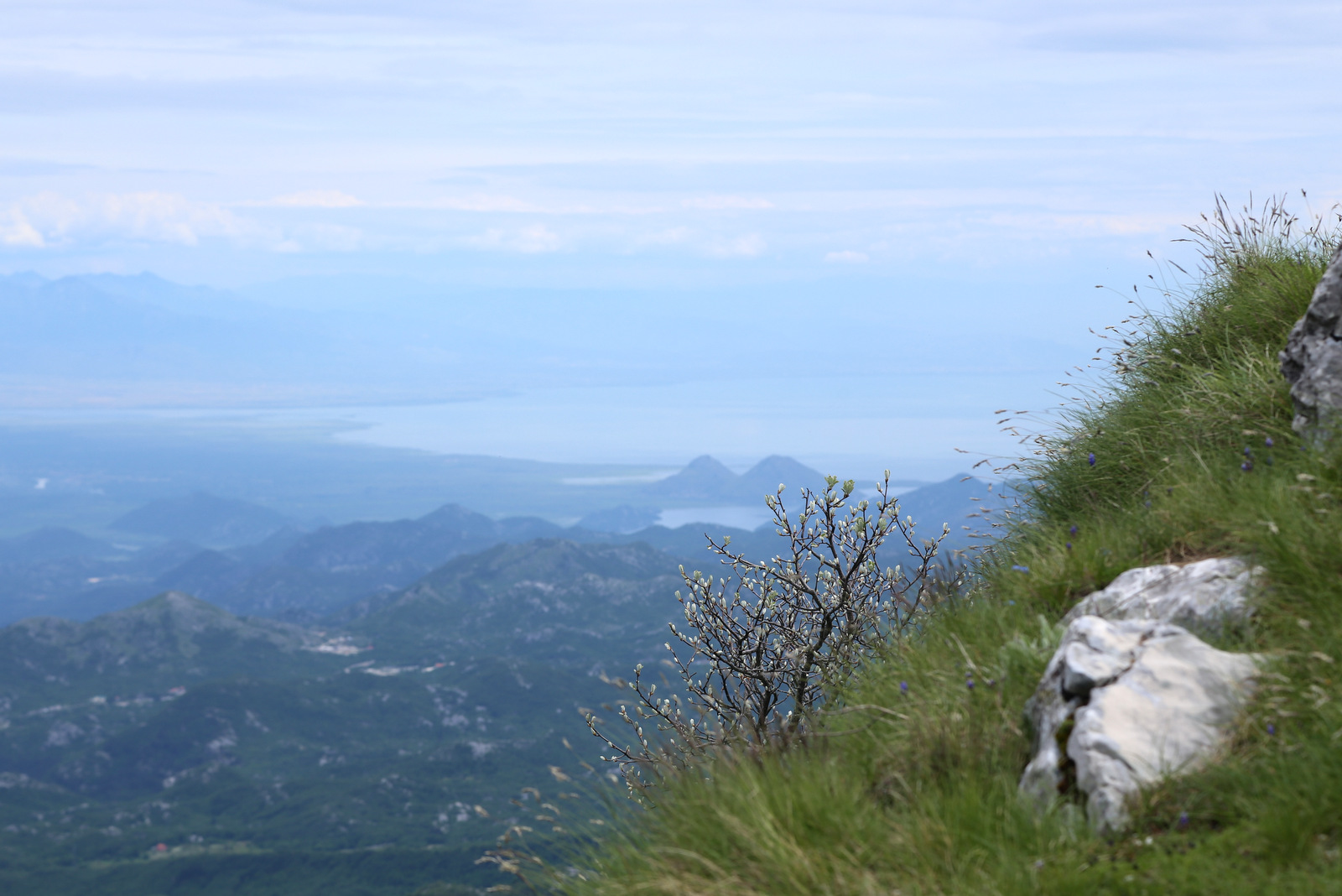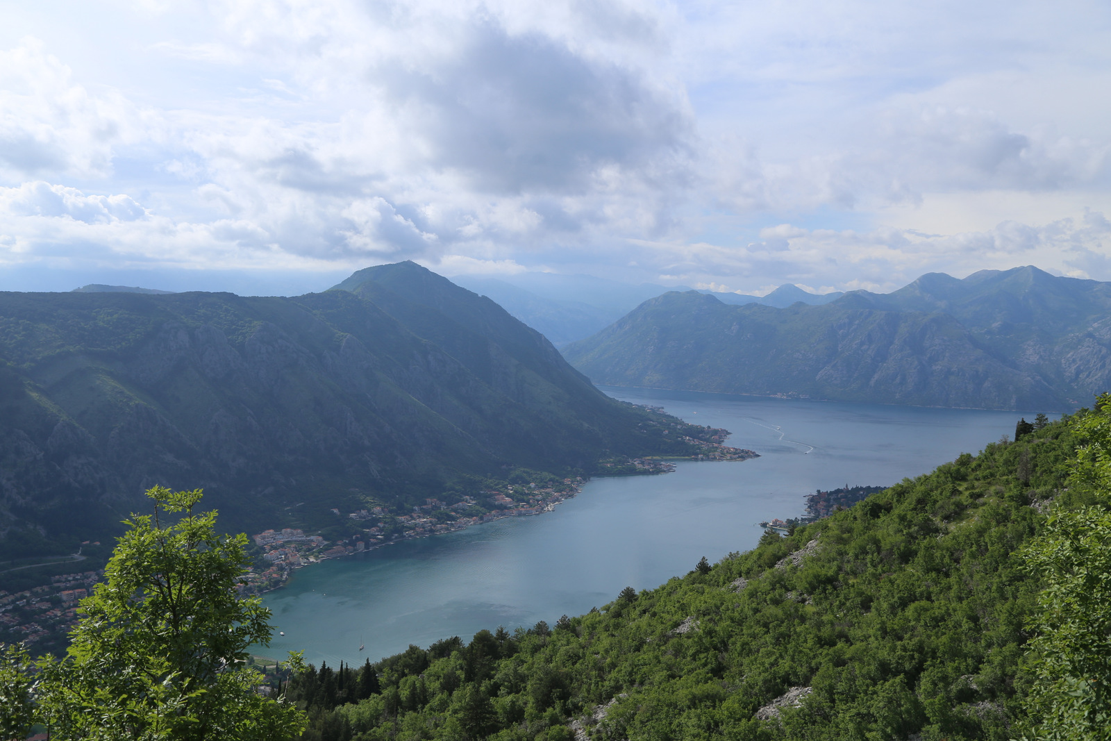 Gražią saulėtą dieną čia būtų tikrai puiku – šiandien, deja, aplink vyrauja pilka spalva, horizontas apsitraukęs rūku, matomumas prastas. Bet vis tiek įspūdinga. Net ir Kotoro įlankos gabaliukas matosi, ir Skadar ežeras kitoje pusėje. Po aikštelę plaikstosi rusų šeimyna, visaip vieni kitiems pozuoja, darosi nuotraukas įvairiais kampais, žentas mėgina įkalbėti uošvę atsisėsti ant akmeninės tvorelės, toji dievagojasi, kad numirs iš baimės, bet pagaliau ryžtasi, įtemptai šypsosi į fotoaparatą ir paskui sako, kad labai baisu buvo, bet ko nepadarysi dėl gero kadro. Jiems išėjus, liekam vieni, apsupti kalnų tylos ir padūmavusių tolių.