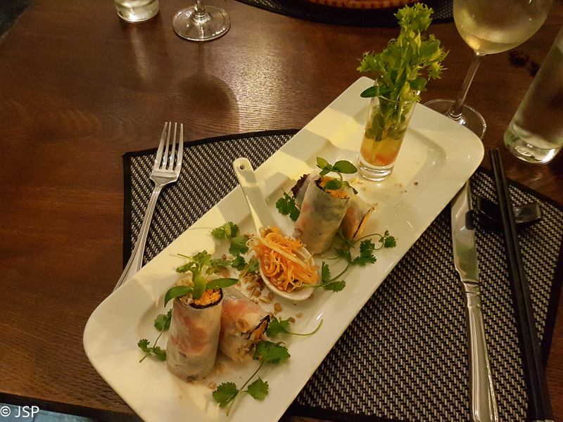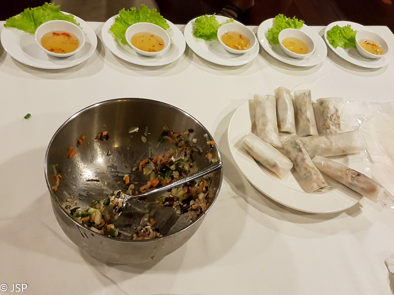 Grįžus po ekskursijos, gidas mums surengia kulinarinę valandėlę – pademonstruoja, kaip pagaminti vietnamietiškus suktinukus (spring rolls). Šis daug kur Pietryčių Azijoje sutinkamas patiekalas kažkada buvo gaminamas tik pavasarį, todėl ir gavo tokį vardą, “pavasario suktinukai”. Suktinukai būna dviejų rūšių – švieži arba virti aliejuje. Šviežių suktinukų gamybos procesas nesudėtingas – įdaras (daržovės, žalumynai, plius mėsa, žuvis ar jūros gėrybės) suvyniojamas į vandenyje pavilgytą ryžių popieriaus lakštą, tvirtai užlankstomi kraštai, ir viskas – jau galima valgyti. Pamėginame ir mes pagaminti po suktinuką, o paskui draugiškai suvartojame savo kūrinius. Dar visi gauname po taurelę ryžių vyno, fermentuoto kokoso kevale (netikėtai skanu, ypač kokoso poskonis pabaigoje) ir parepetuojame vietnamietišką tostą – žodžius, aišku, iškart pamirštame, bet dar prisimenu, kad šaukti reikia labai garsiai ir visiems kartu, ir tik tada, kai pasiektas reikiamas decibelų kiekis, jau galima gerti.