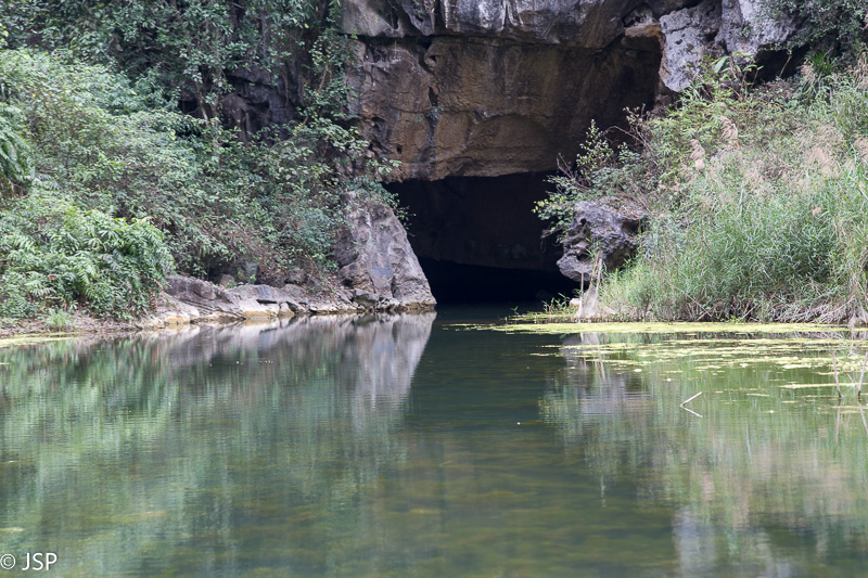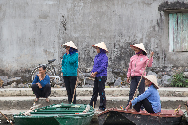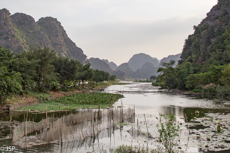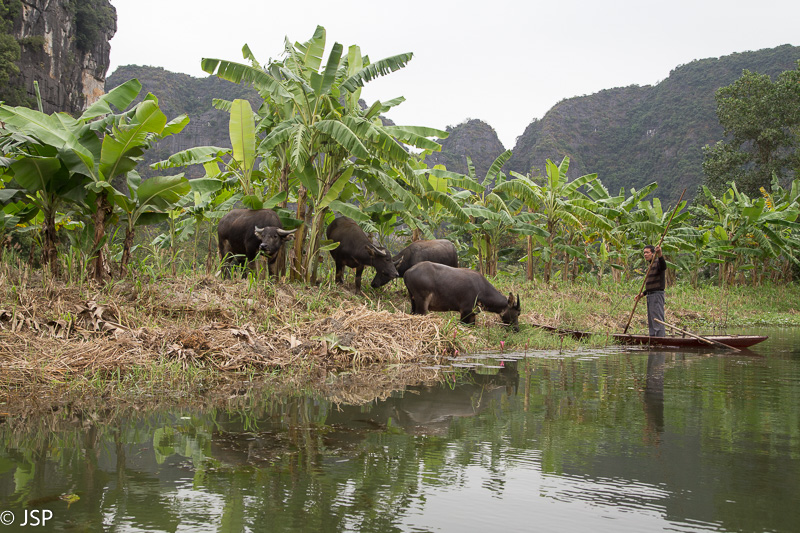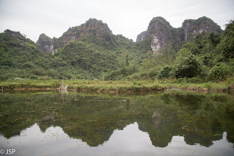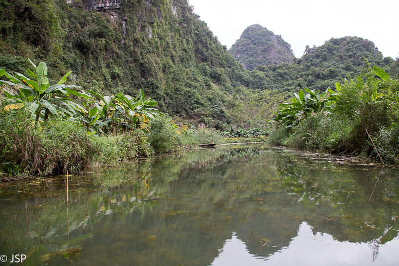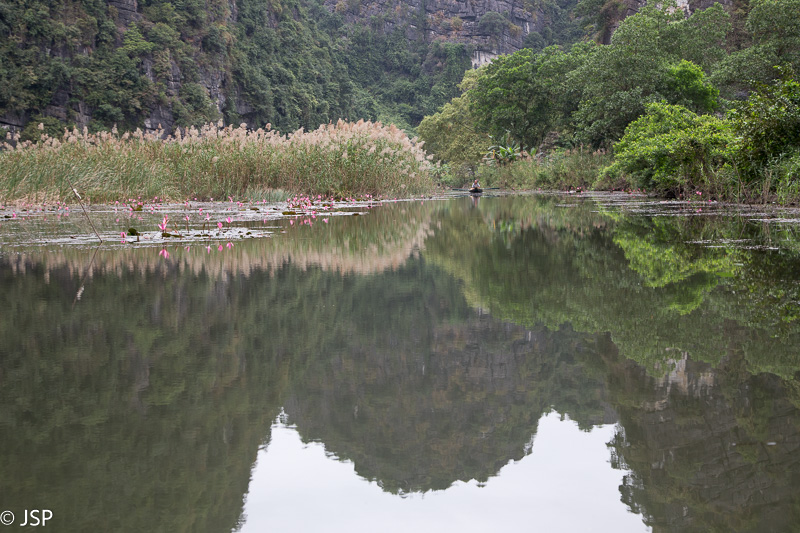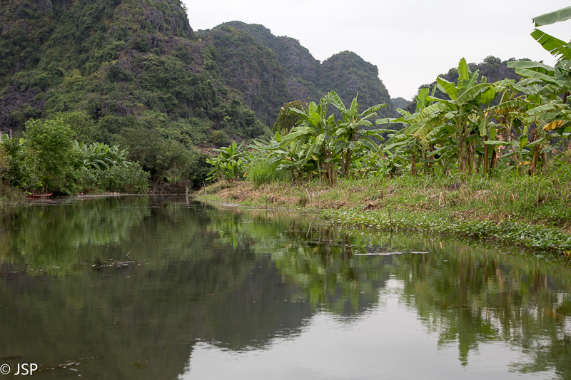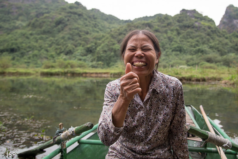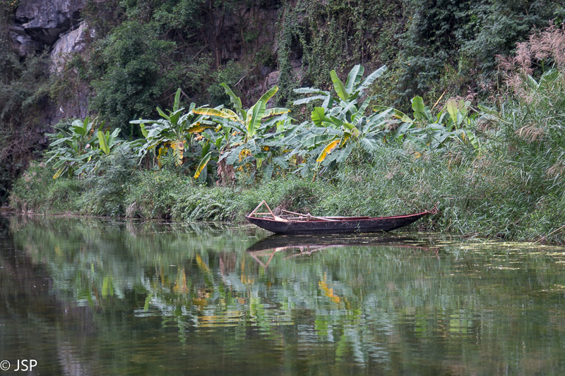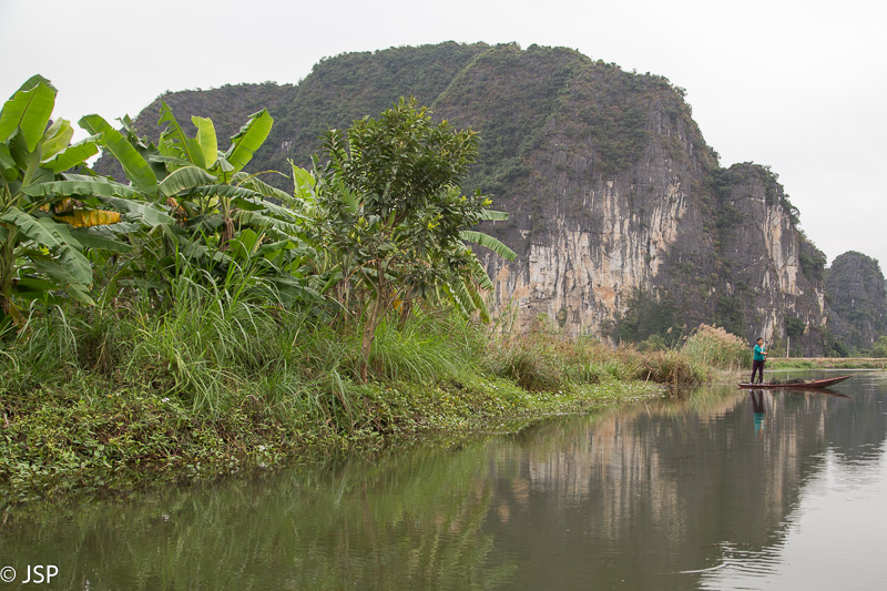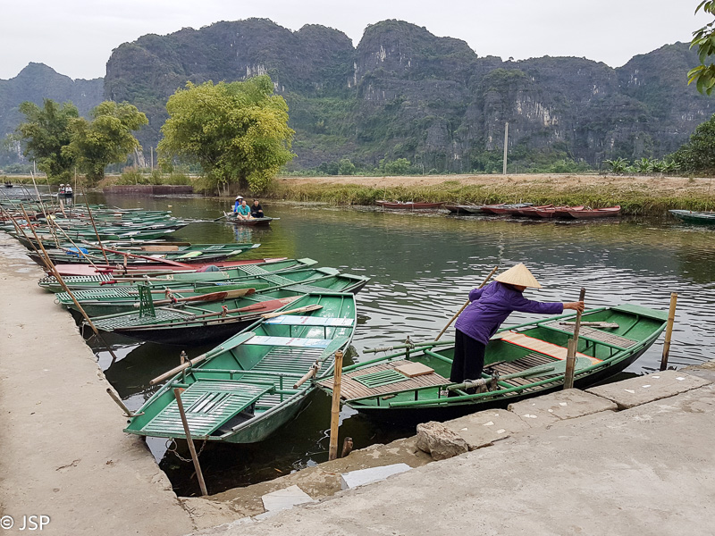 Kitas šios dienos programos punktas – plaukiojimas tradicine medine valtele, sampan. Irkluotoja, pagyvenusi vietnamietė, pasitinka mus plačia šypsena ir gestais rodo lipti į valtį. Angliškai ji moka tik kelis žodžius, ir dar kelis prancūziškai. Gidas lieka ant kranto, o mes plaukiame tolyn ramia lėta upe, tarp žalių Ninh Binh kalvų. Gaila, kad diena tokia pilka ir apniukusi – jei šviestų saulė, ta visų smaragdo atspalvių žaluma turėtų atrodyti tikrai nuostabiai. Dabar gi belieka mėgautis mus supančia tyla ir ramybe. Plaukiame lėtai, aplink visiškai tuščia, tik dar kelios valtelės matosi tolumoje, tyloje girdisi tik irklų pliaukšėjimas. Moteris irkluoja pakaitomis rankomis ir kojomis, ir mūsų nuostabai kojomis jai gaunasi beveik greičiau.
