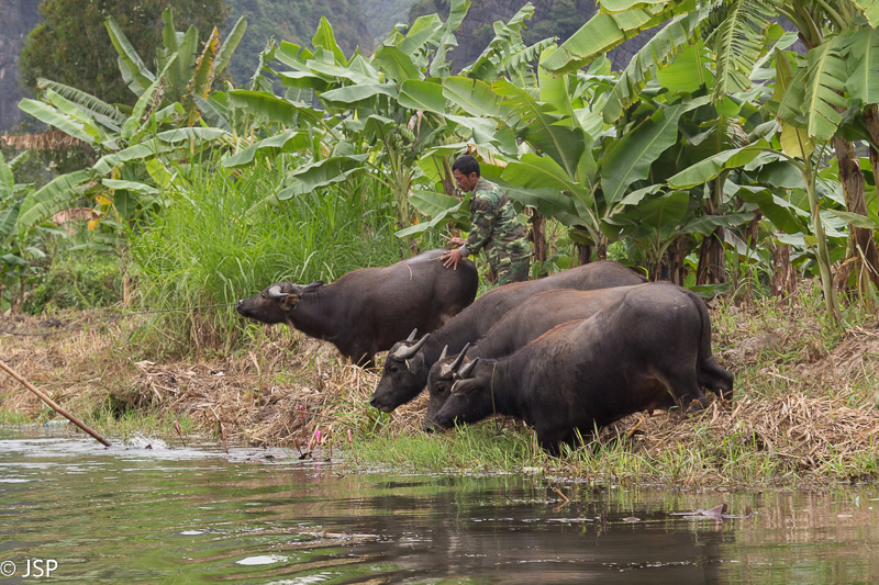 Du vyrai pakrantėje bando suginti vandenin kelis vandens buivolus. Buivolai kažkodėl visai nepageidauja palikti kranto, vienam iš vyrų tenka juos stumte stumti. O mes įsivaizdavome, kad vandens buivolai mėgsta būti vandenyje!
