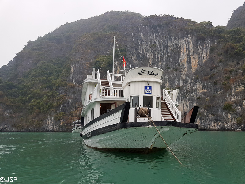 Einame ieškoti savojo kruizinio laivo, kuris šiandien ir rytoj mus plukdys po grąžiąją Halong įlanką. Pasirinkome kruizo variantą su nakvyne laive, kad nereikėtų skubėti ir galėtume pamatyti įlanką įvairioje šviesoje, skirtingu dienos metu. Laivas nedidelis, jame iš viso 6 kajutės, viena jų skirta įgulai. Keleivių dvylika – mudu su vyru, dvi poros kanadiečių ir dvi poros indų su vaikais. Kajutė jauki, nors ir nedidelė, bet yra visi patogumai ir netgi balkonas, kur galima bus sėdėti ir mėgautis vaizdais.