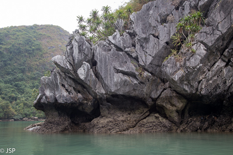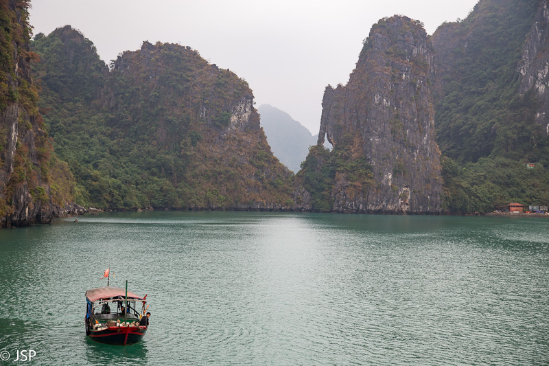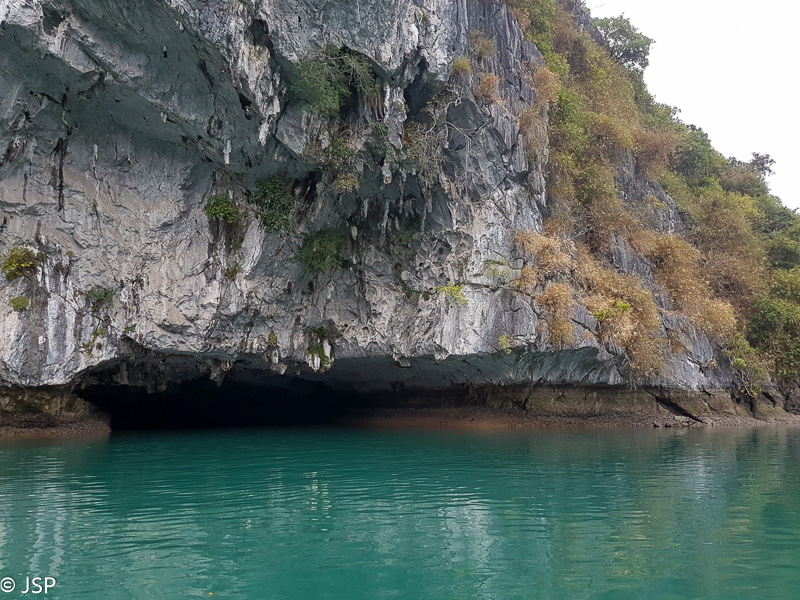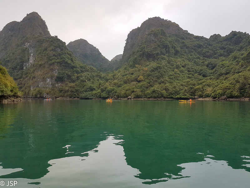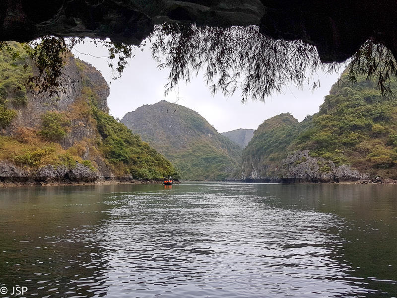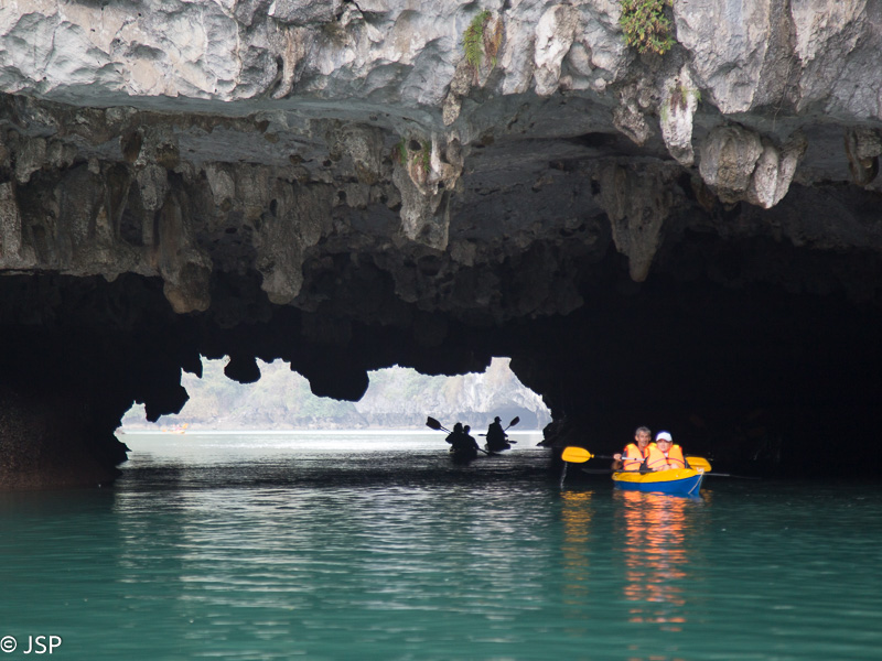 Jau pavakare priplaukiame Cat Ba nacionalinio parko pakraštį. Sustojame nedidelėje ramioje įlankoje, lipame į pripučiamą guminę valtį ir plaukiame iki nedidelės pašiūrės ant polių kitoje, mažesnėje, įlankoje. Laikas ekskursijai po Cat Ba – baidare arba valtele. Kanadiečiai renkasi baidares, mes gi norime pafotografuoti, tad lipame į valtį kartu su indais. Lėtai plaukiame per žaliai švytintį vandenį, tyliai pliaukši irklai, iš visų pusių mus supa aukštos žalios sienos. Kelis kartus plaukiame po žemai virš vandens kabančiomis uolomis – iš tolo atrodo, kad praplaukti nėra kur, bet iš tiesų erdvės daugiau negu gana, net pasilenkti nereikia.