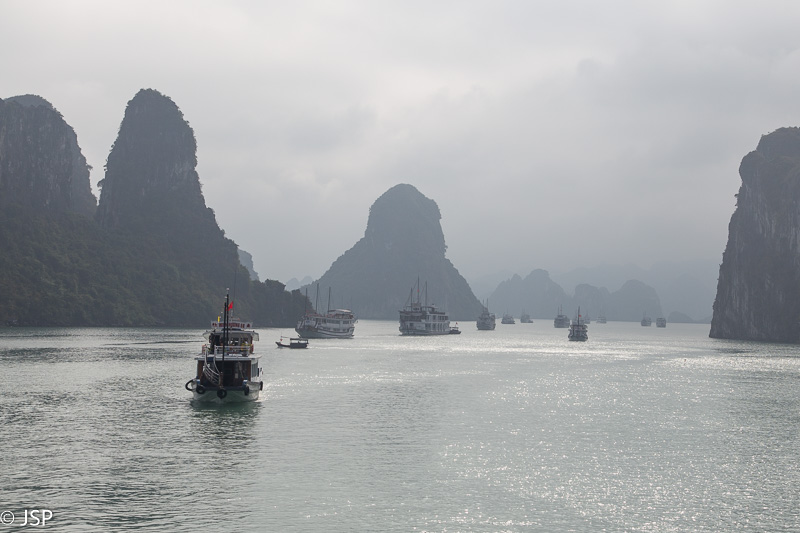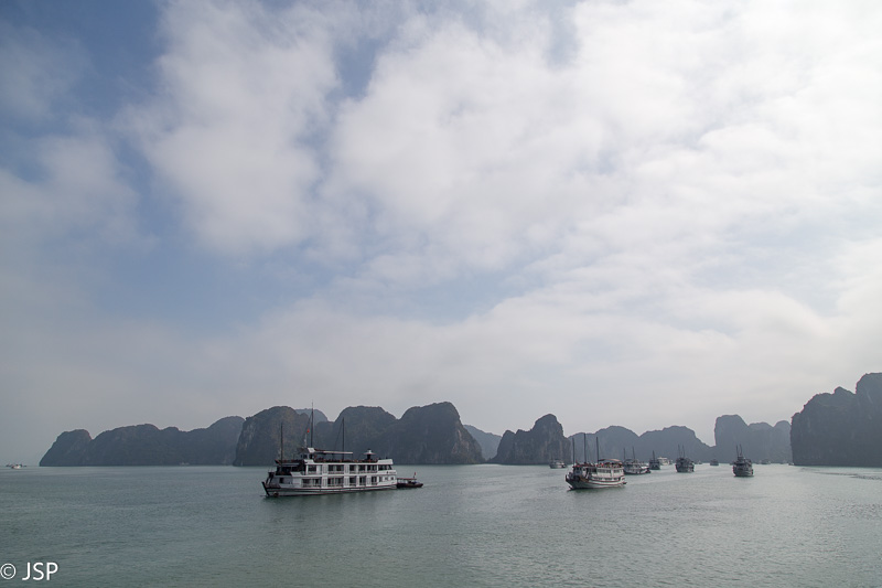 Mūsų trečioji diena Vietname turėtų būti ypatinga. Šiandien laukia dviejų dienų kelionė į Halong įlanką – žinomiausią ir labiausiai lankomą Vietnamo vietą, Pietryčių Azijos perlą, o gal net aštuntąjį pasaulio stebuklą, žiūrint kokį informacijos šaltinį skaitysi. Halong įlanka yra priežastis, dėl kurios atsidūrėme šiaurės Vietname. Klimatas žiemos mėnesiais čia nelabai palankus viešnagėms – šalta, lietinga ir dažnai ūkanota. Būtent dėl oro šiai kalėdinei kelionei pasirinkome pietinį Vietnamą, bet vėliau aš visgi neatsispyriau pagundai ir įtraukiau į maršrutą Hanojų ir Halong įlanką, tikėdamasi, kad orų dievai mūsų pasigailės ir atsiųs gerą orą. Deja, nuo pat ryto lauke tvyro rūkas. Kai palikę lagaminus viešbutyje tik su rankiniu bagažu važiuojame taksi į oro uostą, aplink beveik nieko nesimato, viskas paskendę tirštame pilkame rūke. O mūsų juk laukia nepigus skrydis mažu lėktuvėliu iki Halong ir 15 minučių trukmės apžvalginis turas virš gražiosios įlankos. Bandome nusiteikti optimistiškai ir sakome sau, kad gal tas rūkas tik Hanojuje, o virš įlankos švies saulė? Oro uoste ilgai neužtrunkame ir dešimtą ryto jau sėdime 12-viečiame lėktuvėlyje. Kanadietis pilotas sako, kad matomumas virš įlankos nekoks, ją nugulę tiršti žemi debesys, bet yra šiek tiek vilties, kad kol mes atskrisime, jie prasisklaidys. Skrendame kiek daugiau nei pusvalandį, per tankius debesis, lėktuvą smarkiai krato, matomumas nulinis, nuotaika sparčiai krenta. Pagaliau pasiekiame įlanką, debesys labai trumpam prasisklaido, gal pusę minutės galime gėrėtis daugybe žalių salelių, o paskui viską vėl uždengia tirštas debesų pienas ir pilotas sako, kad apžvalginio skrydžio nebus, nes per daug pavojinga skristi žemai virš salų tokiomis oro sąlygomis. Tokiai skrydžio pabaigai jau buvome pasiruošę, bet vis tiek labai apmaudu – apžvalginis skrydis virš nuostabaus grožio įlankos turėjo tapti visos kelionės vinimi. Nepasisekė.