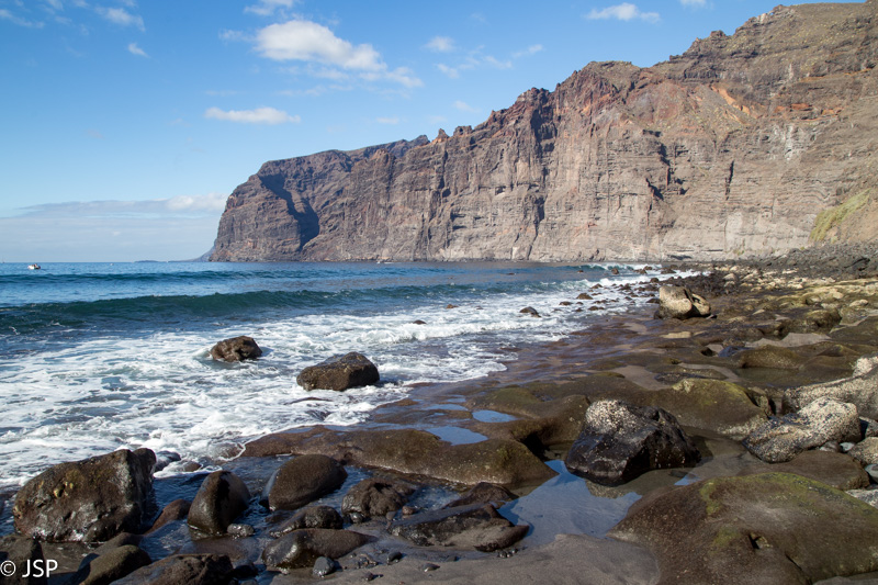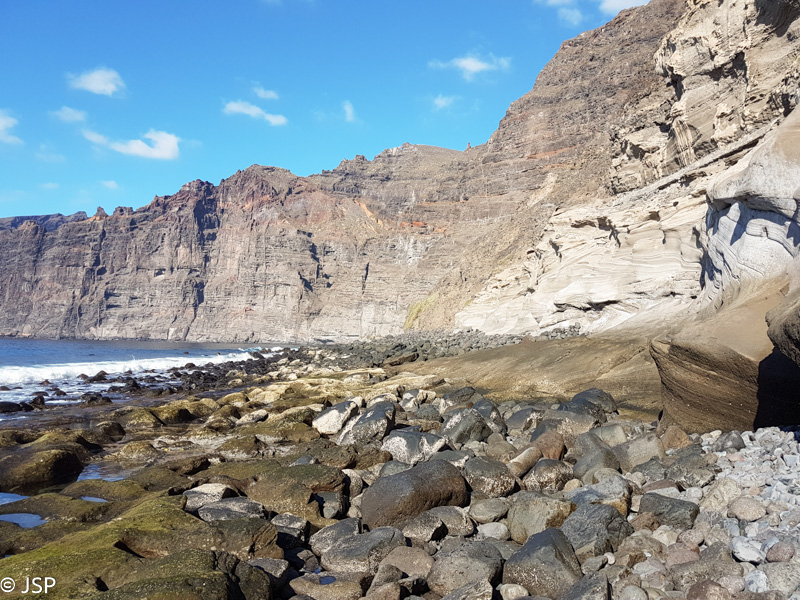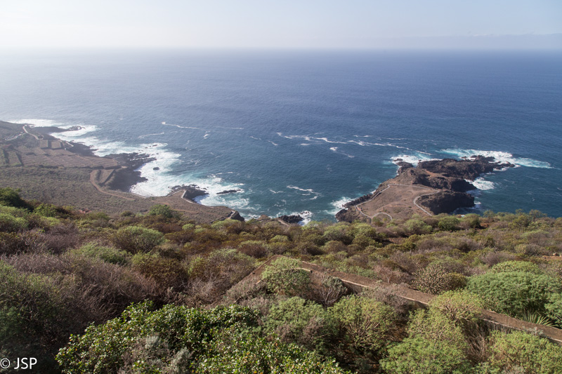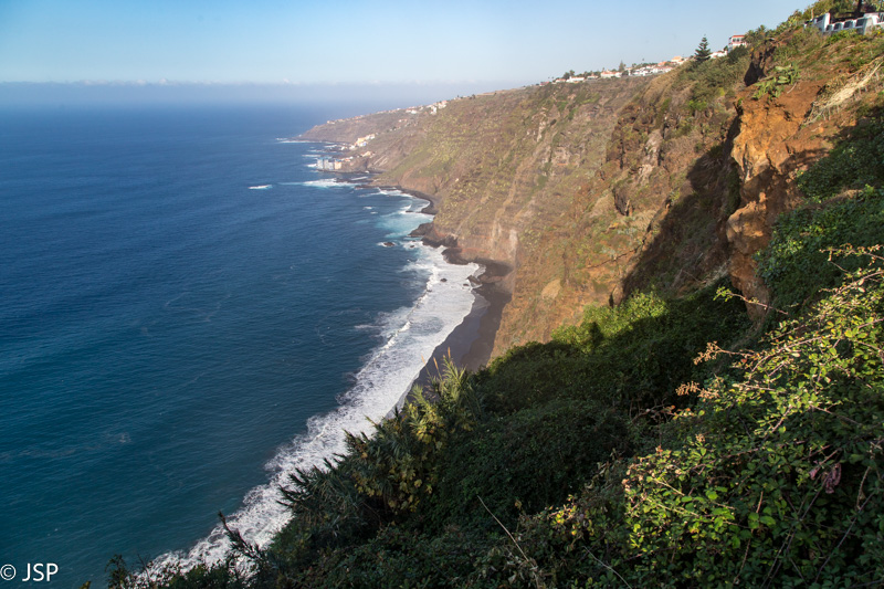 Nieko nepešę grįžtame prie mašinos ir nusprendžiame, kad gal jau nebeieškosime šiandien nuotykių. Pusė keturių, metas namo. Bet jau visai miestelio pakraštyje užmatome ženklą į Mirador de La Garanona ir susigundome ten užsukti. Užsukti tikrai verta – pakrantės vaizdai labai gražūs. Ir iškart aišku, kodėl neradome tako į El Sauzal pliažą – jis ten, toli apačioje, statmenų poros šimtų metrų aukščio uolų papėdėje!