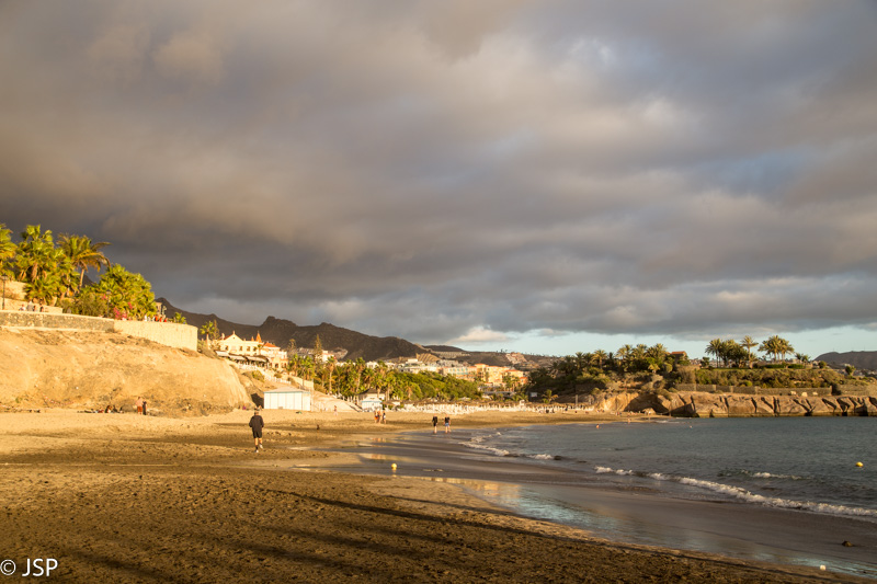 Kažkokia keista diena šiandien – Orotavoje saulės neradome, žygis į juoduosius smėlynus nepavyko, planas pasišildyti saulutėje Los Gigantes pliaže irgi nuėjo šuniui ant uodegos. Jau nebeturime ūpo dar ką nors planuoti ir nusprendžiame važiuoti namo. Bet šioje salos dalyje eismas daug intensyvesnis nei mūsų pustuštėje šiaurėje – dar net nepasiekę Los Cristianos pakliūvame į didžiulį kamštį greitkelyje. Kamščiuose mes sočiai prisistovime ir namie, per atostogas mums jų tikrai nereikia, taigi sukame į artimiausią išvažiavimą ir pastatę mašiną La Caleta miestelyje einame link El Duque pliažo. Ketiname tik pasivaikščioti pakrante, bet užsibūname iki vėlaus vakaro – pabraidome po jūrą, palydime saulę, o paskui dar ir pavakarieniaujame netoli esančiame pakrantės restorane. Vakarieniaudami kalbamės apie šiaurinės ir pietinės Tenerifės privalumus ir trūkumus. Pietuose žiemą vakarais daug šilčiau – užtenka ilgų rankovių, kai tuo tarpu vakariniam pasivaikščiojimui po La Laguna visada tenka vilktis ploną pūkinę striukę, nes retai būna šilčiau nei +13. Bet visgi mums abiems labiau patinka gyventi ramiame ir jaukiame La Laguna mieste.