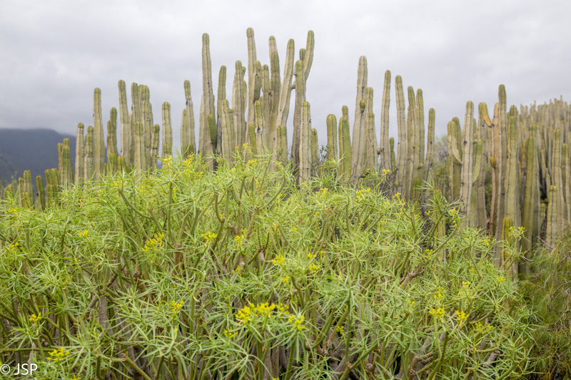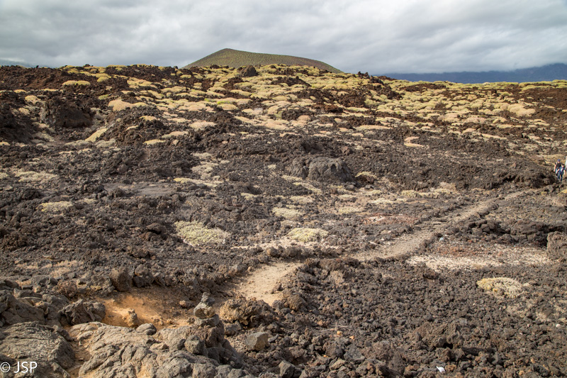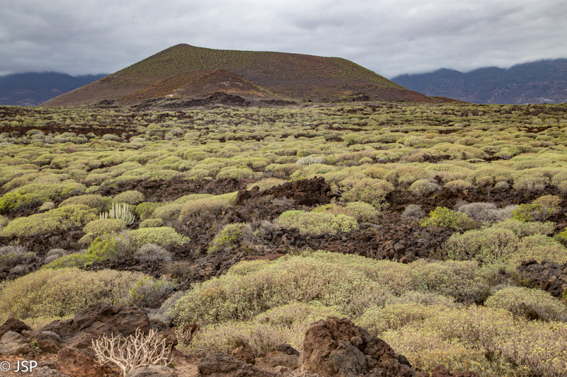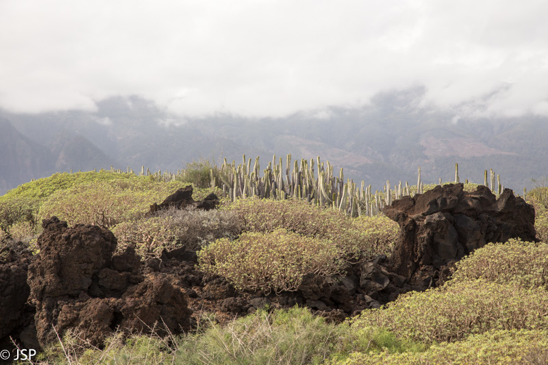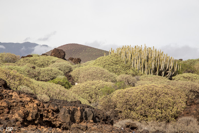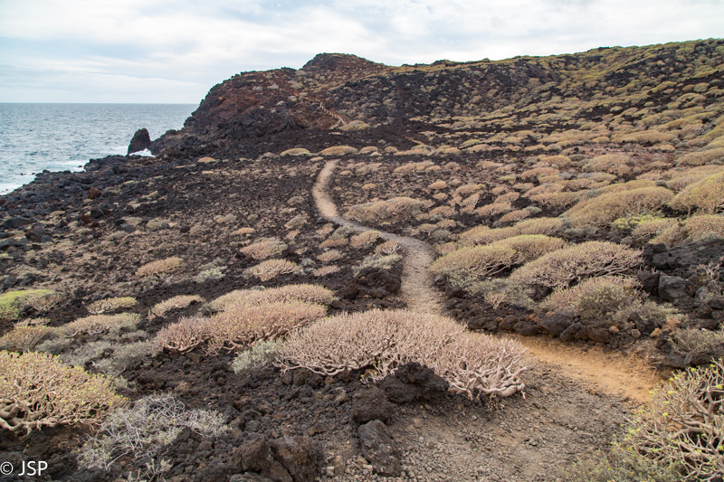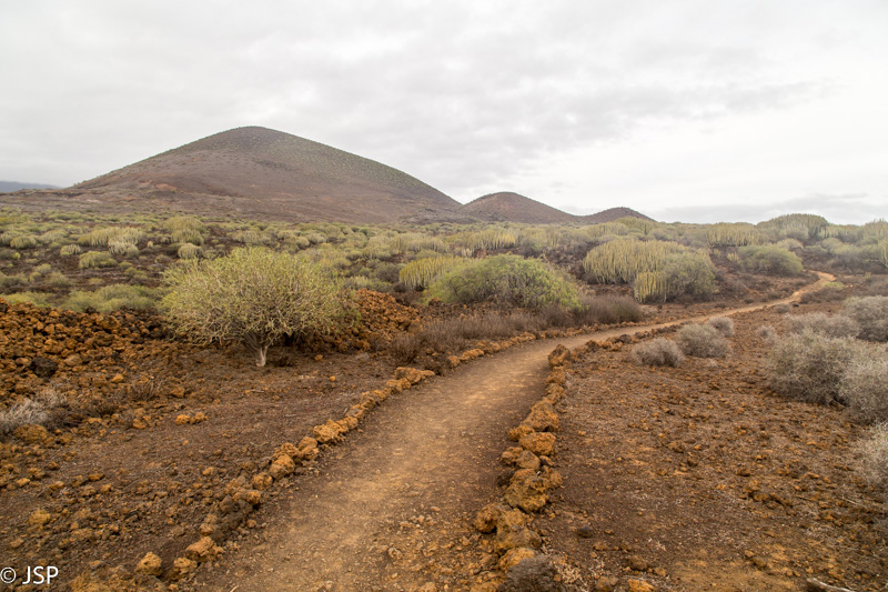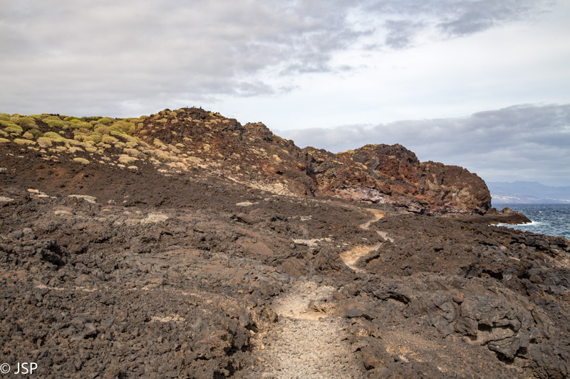 Šiuo taku galima nueiti iki gretimo kurorto, bet mes sekame trasos ženklos ir sukame tolyn nuo pakrantės, link Montana Grande, kurį apeiname papėdėje vinguojančiu taku. Saulė tuo tarpu vėl pasislepia, dangų aptraukia debesys, peizažas papilkėja. Bet ir apniukusią dieną skaidria žaluma švyti euforbijų miškeliai tarp lavos sangrūdų.