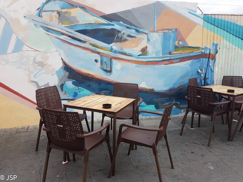Prisėdame gatvės kavinukėje kavos puodelio, pasivaikštome ant molo – jau ir pusė pirmos, laikas pietauti. Šiandien ragauju naują patiekalą – cachapa. Tai kukurūzų miltų blynas su įdaru (tradicinis Venesuelos patiekalas, kažkaip atsiradęs Kanarų salos meniu). Nepasakyčiau, kad skanu – sausa, sprangu ir gerokai prėska.