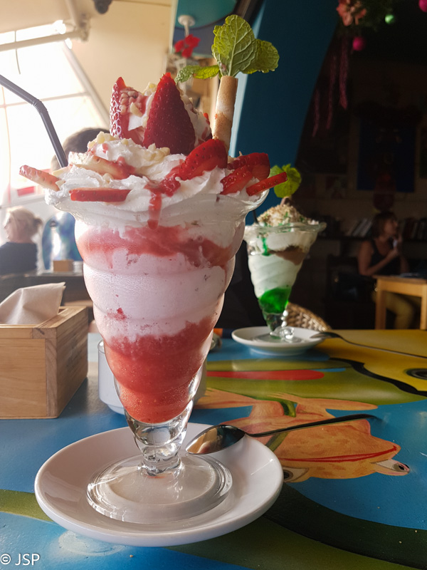Nors ir neįkopėme į Montana Roja, jaučiamės šiandien pakankamai padirbėję kojomis ir nusipelnę ledų. Tik kai juos atneša, susiprantame, kad galėjome ir vieną porciją per pusę pasidalinti – tiesiog nesitikėjome tokio kiekio!
