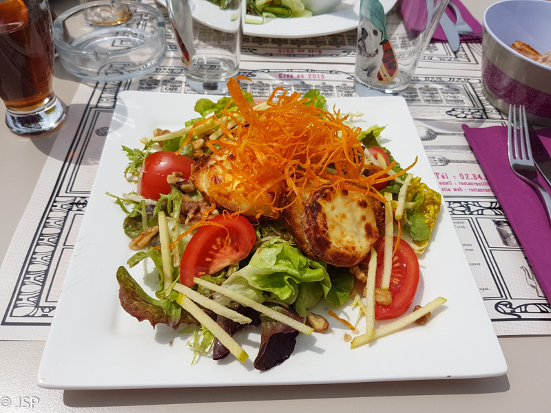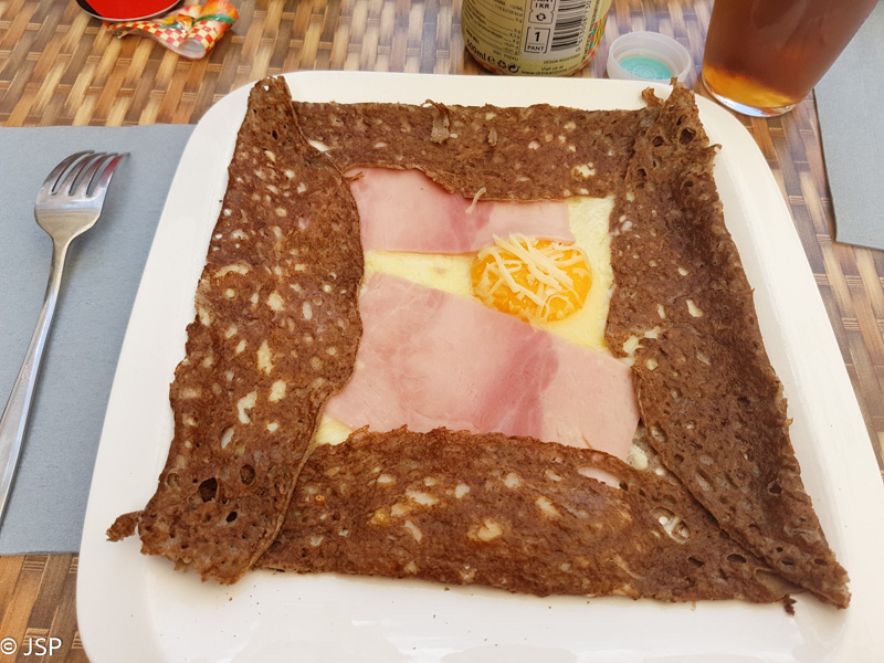 Senamiestis jaukus, tvarkingas ir pilnas veiksmo. O mums jau norisi ką nors į skrandį įmesti, pusryčiai juk jau seniai buvo. Užmatę blyninę, sėdame prie staliuko lauke ir užsisakome galette bretonne – grikinių blynų su įdaru pasirinktinai. Tai tipiškas Bretanės patiekalas, populiarus ir kituose Prancūzijos regionuose. Mes šiuos blynus labai mėgstame, o čia jie dar ir labai skanūs.