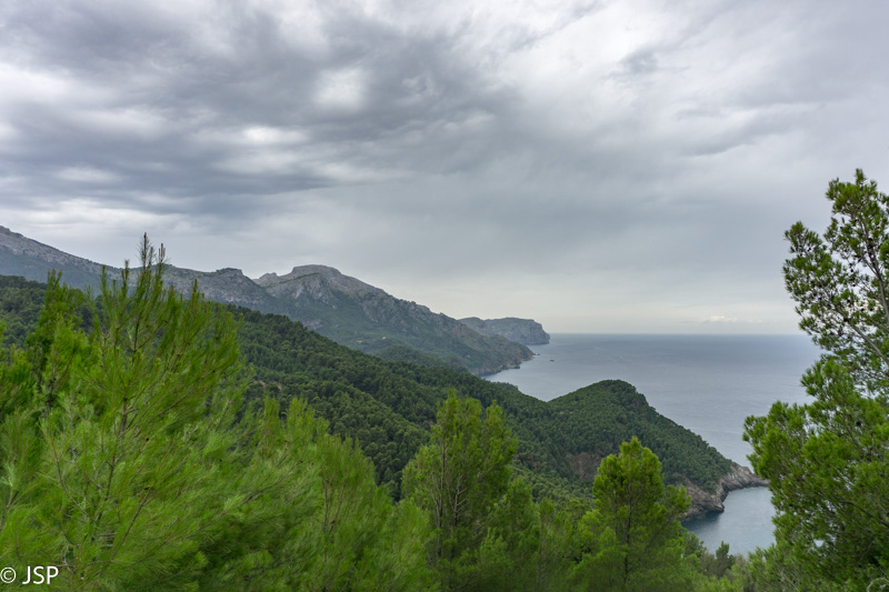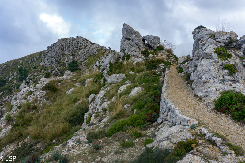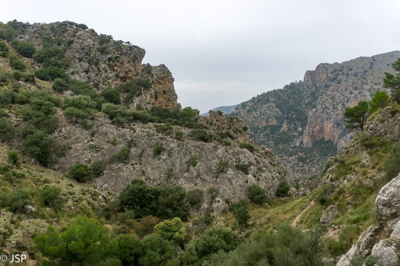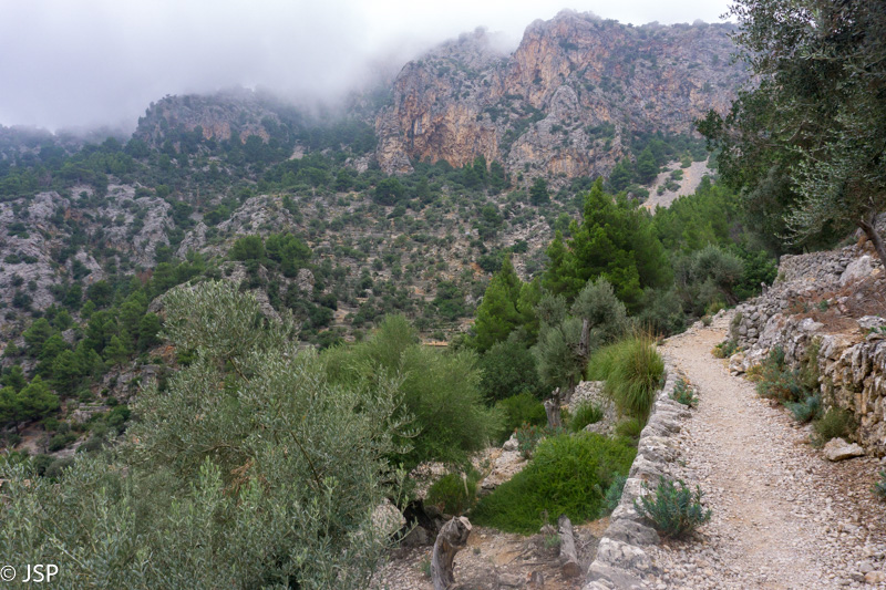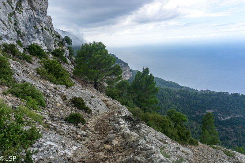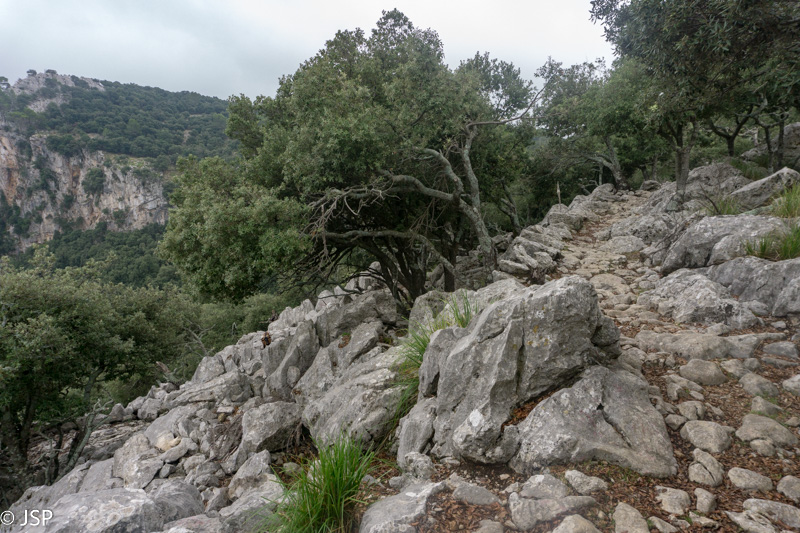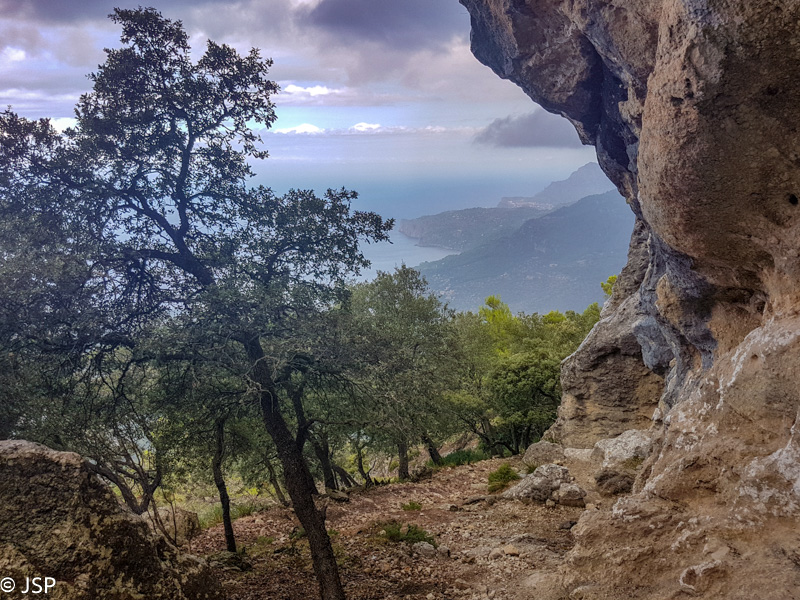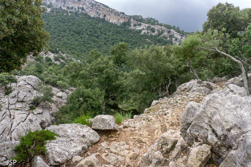 Netrukus takelis atveda į labai klaidžią vietą – aplink statmenos uolos, toks įspūdis, kad jokio tako žemyn į pakrantę išvis nėra. Trasos aprašymuose perspėjama, kad labai svarbu surasti tą vienintelį saugų taką nusileidimui į Deia, bet ženklai visiškai neaiškūs, takelių daug, navigacija grybauja… Kiek paklaidžioję taką visgi randame, nors iki šiol nesu tikra, ar tai buvo būtent tas „vienintelis“ takas, nes vietomis jis buvo toks status, kad net suabejodavom, kur mes čia juo išeisim. Šią trasos dalį prisimenu be didelio džiaugsmo – takas status ir slidus, vingiuoja serpantinais per šlapiais pernykščiais lapais nuklotus šlaitus, vaizdų pirmąją valandą išvis beveik nėra. Galiausiai dar pradeda lyti, ir smarkiai, tenka traukti neperlyjamas striukes ir apvalkalus kuprinėms. Bet pagaliau takas kiek išsilygina, eiti tampa lengviau, atsiranda ir šiek tiek vaizdų. Užmatę uolėtą aikštelę netoli tako, sėdame pailsėti. Bendražygė paslysta ant šlapių uolų ir griūna; laimei, be rimtų pasekmių. Akivaizdu, kad esam jau smarkiai pavargę, o eiti dar nemažai liko.