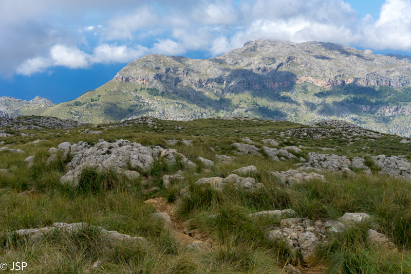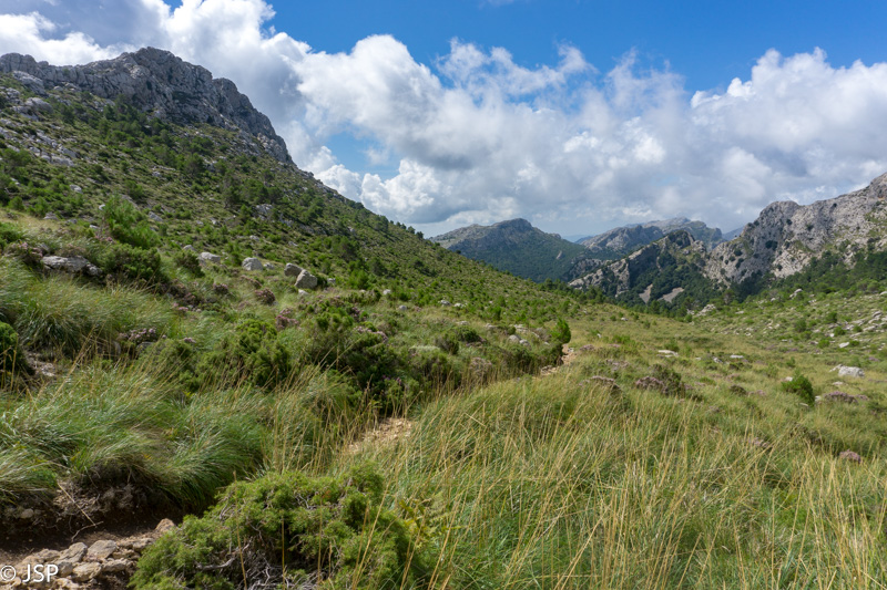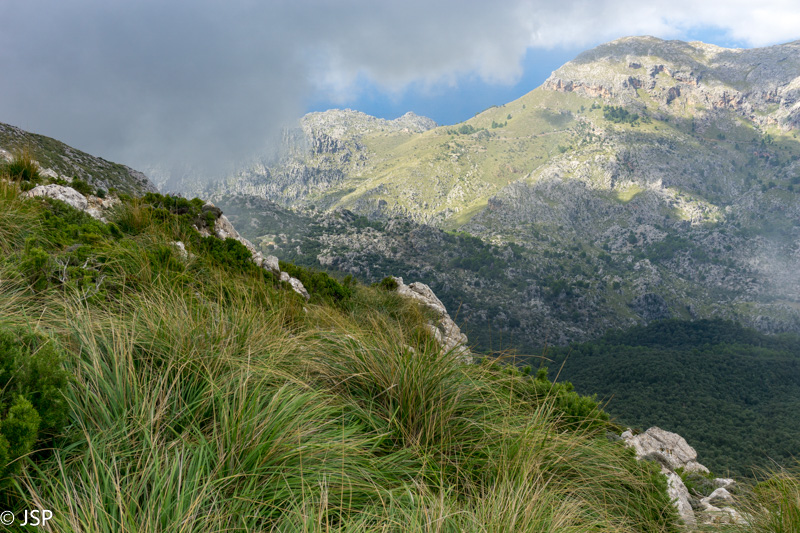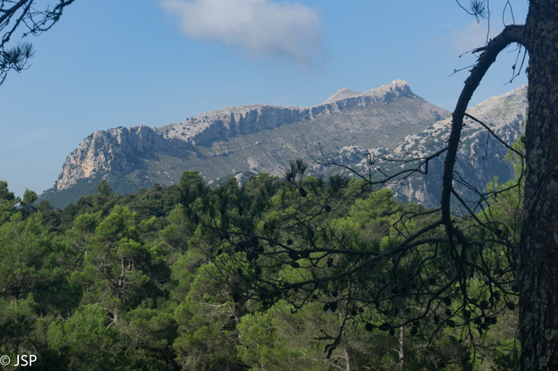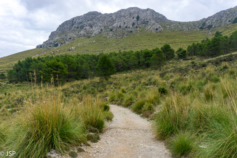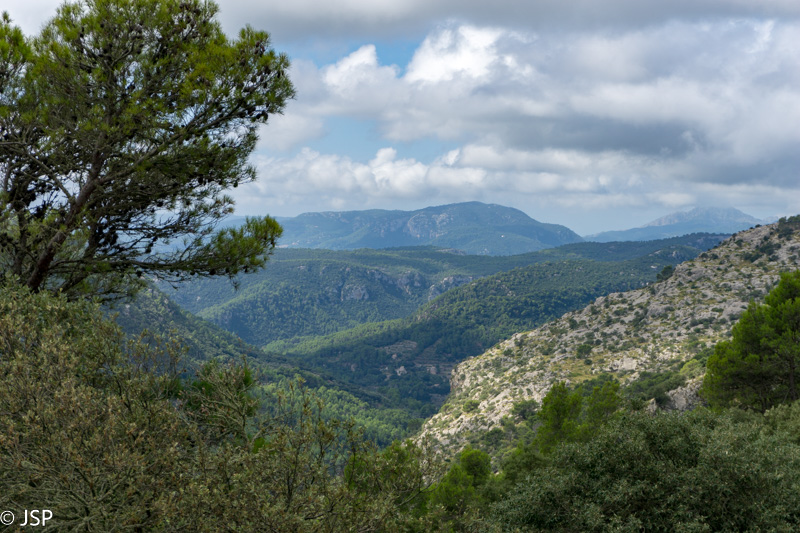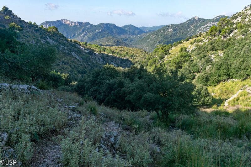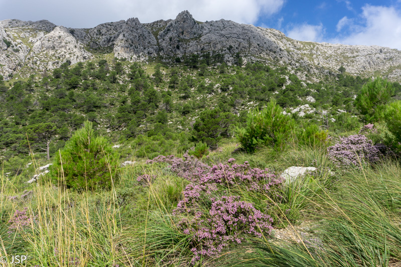 Pasiekiame vakar praeitą sankryžą miške, ir dabar jau sukame link Lluc, mūsų šios dienos tikslo. Gerą valandą einame per mišką, takas lipa vis aukštyn, vaizdų jokių, eiti sunku ir nuobodu. Bet galiausiai pakylame virš miško ir atsiduriame žydinčiais viržiais apaugusioje lygumoje, apsuptoje saulės nušviestų pilkai žalių kalnų. Prasideda gražioji trasos dalis.