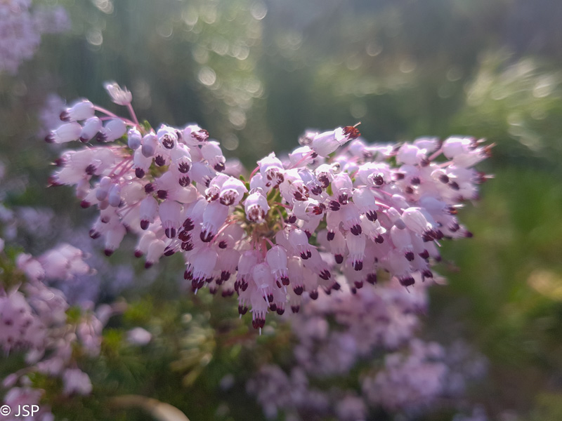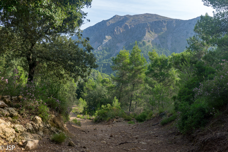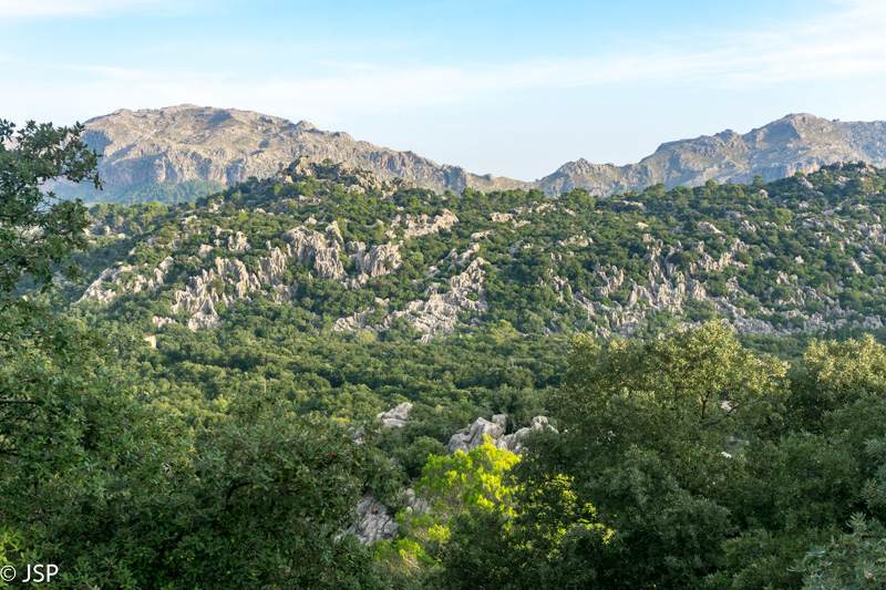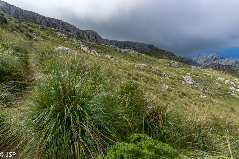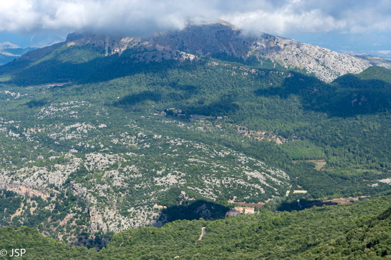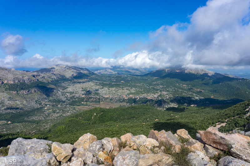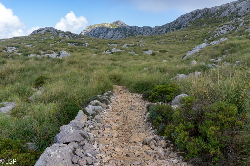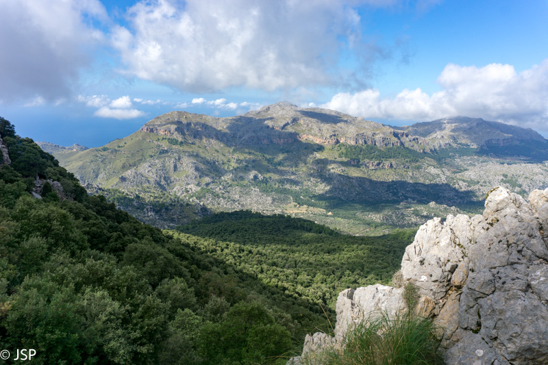 Pasiekiame vakar praeitą sankryžą miške, ir dabar jau sukame link Lluc, mūsų šios dienos tikslo. Gerą valandą einame per mišką, takas lipa vis aukštyn, vaizdų jokių, eiti sunku ir nuobodu. Bet galiausiai pakylame virš miško ir atsiduriame žydinčiais viržiais apaugusioje lygumoje, apsuptoje saulės nušviestų pilkai žalių kalnų. Prasideda gražioji trasos dalis.
