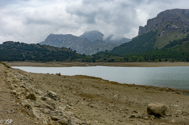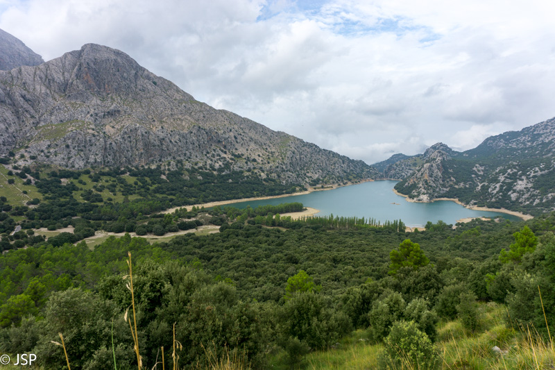 Mūsų takas neria į mišką, bet netrukus išeina į atviresnę vietą su labai gražiais vaizdais į kalnus ir Gorg Blau rezervarą toli apačioje. Oras kvailioja, kelis kartus nulyja, bet galiausiai trumpam išlenda saulė. Prisėdame ant šlapių akmenų, atsipūsti ir pasidžiaugti kalnų ir ežero vaizdais. Ilgai neužtrunkame – ne tik dėl permainingo oro, bet ir dėl vis labiau artėjančio vakaro ir mums dar likusio nemažo atstumo.