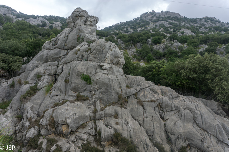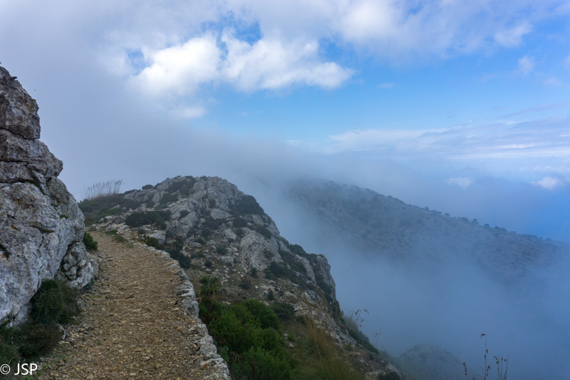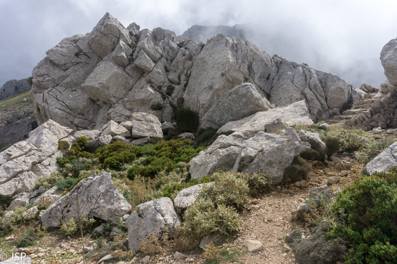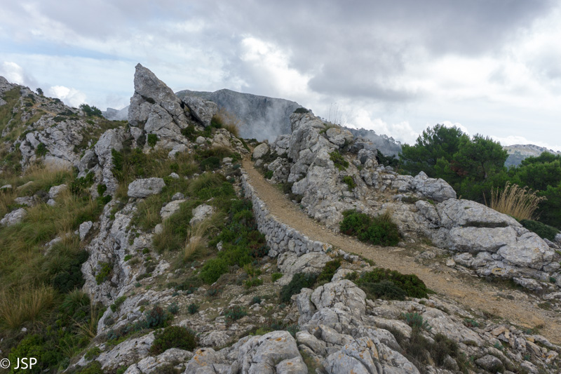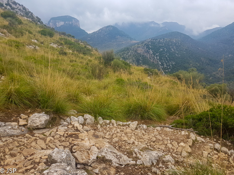Kad ir nėra vaizdų, vis tiek prisėdame pailsėti ant uolų šalia tako. Kiek atsipūtę, pavalgę ir paburbėję ant permainingų kalnų orų, tęsiame žygį, dabar jau žemyn link Deia.