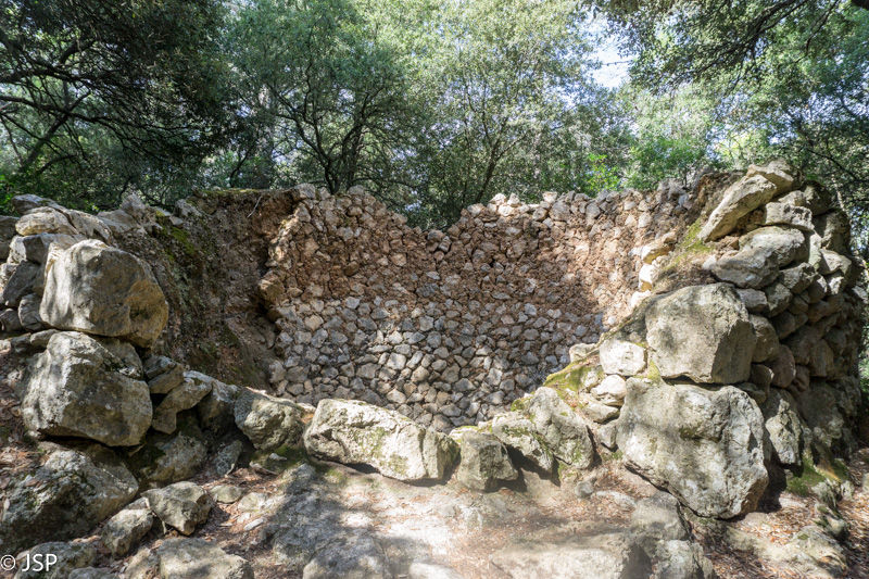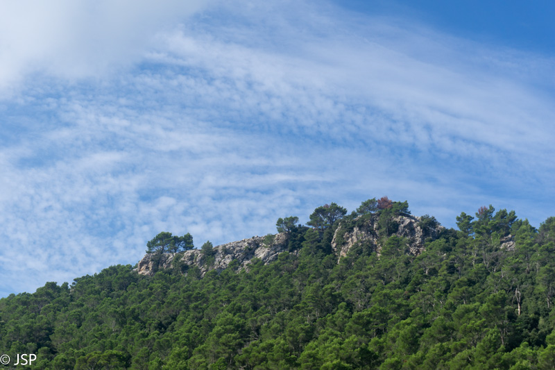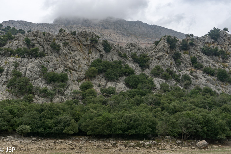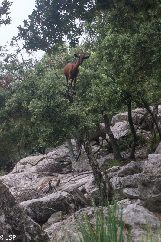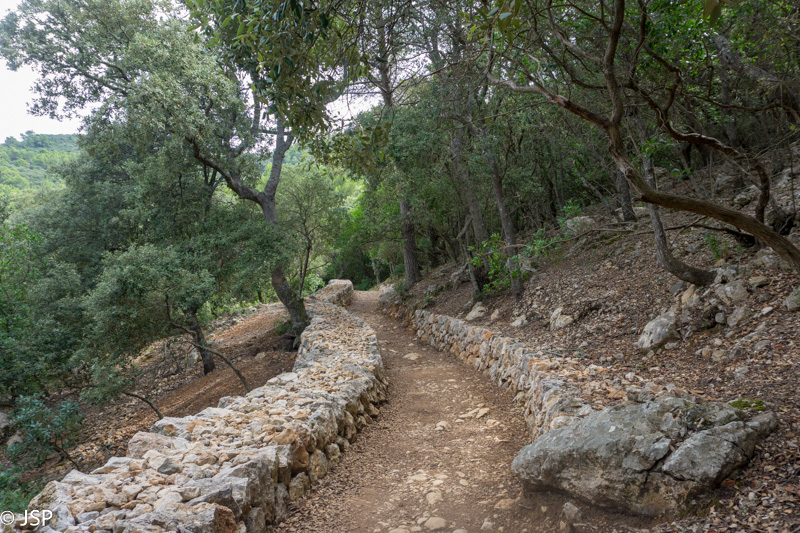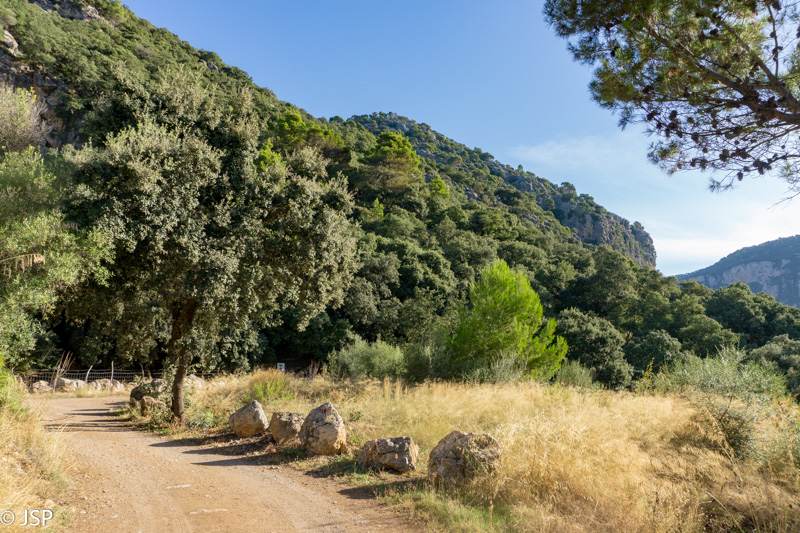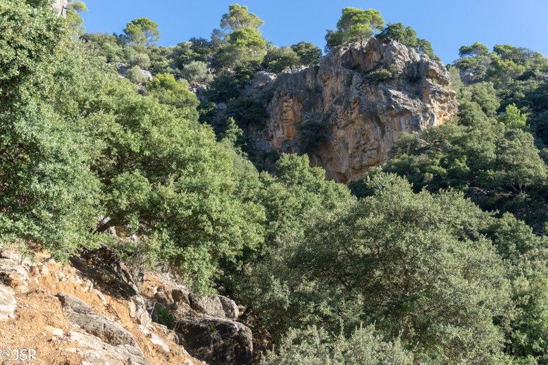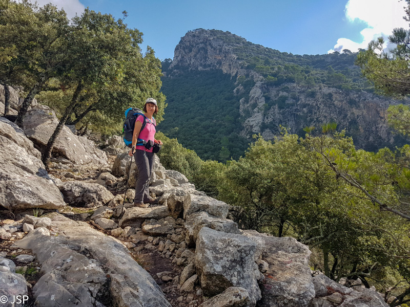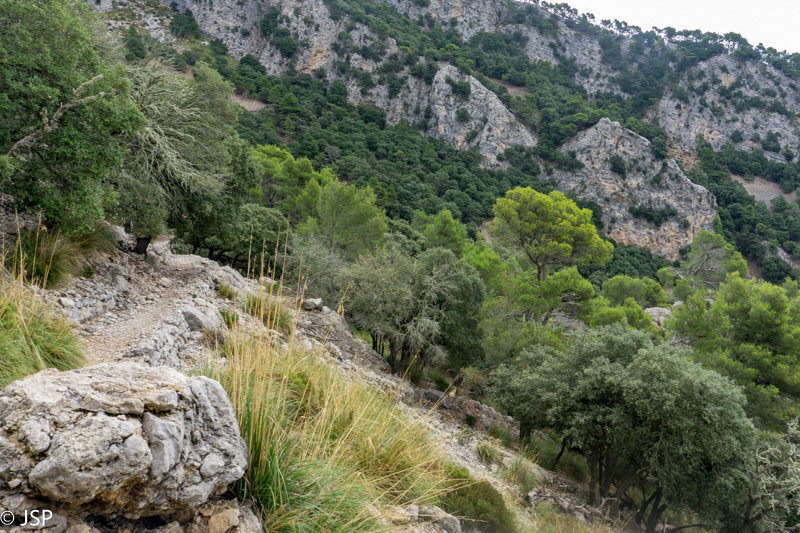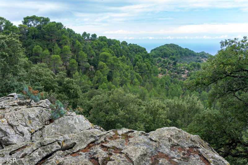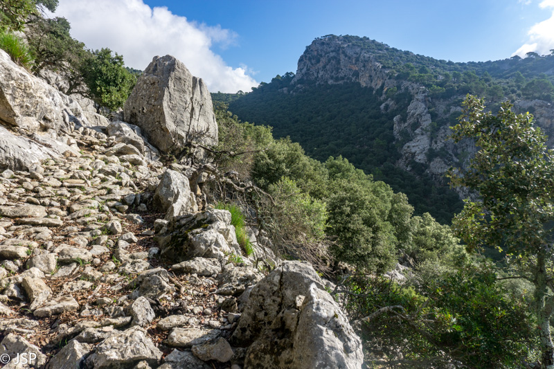 Mūsų džiaugsmas dėl pagerėjusio tako ilgai netrunka – trasa suka į mišką ir takas virsta vos įžiūrimu takeliu per tankius šabakštynus. Keliskart net pametame savo trasą, nei maps.me navigacija nepadeda, nes takų takelių čia daug, tik va kuris tas tikrasis, telieka spėlioti. Galiausiai takas pateikia dar vieną nemalonų siurprizą – gana ilgai tenka eiti per slidžius apvalius akmenis, skaudžiai juntamus net per storus žygio batų padus. Nežinau, kas sugalvojo tokiais bjauriais akmenimis išgrįsti taką į Deia, bet aš jiems tikrai nepadėkočiau.