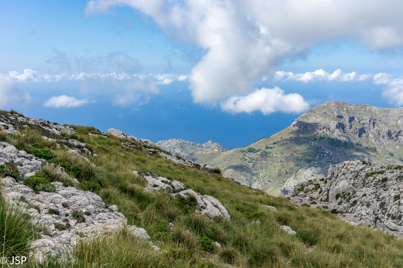 Beje, tokios oro sąlygos ant šios keteros būna dažnai – norint pasidžiaugti vaizdais, reikėtų rinktis ypatingai saulėtą dieną ir keterą pasiekti kuo anksčiau, nes jau nuo vidurdienio dažnai būna debesuota. Mes pasirinkimo nelabai turėjome (nebent išeiti iš Valdemosos galėjom anksčiau, nelaukdamos, kol atsidarys parduotuvė), tiesiog tikėjomės, kad pasiseks su orais. Deja, tas noras neišsipildė. Tenka džiaugtis jau ir tuo, kad porai akimirkų debesys prasisklaido ir galim labai trumpai žvilgtelėti į vaizdus, kuriais ketinome ilgai gėrėtis nuo keteros.