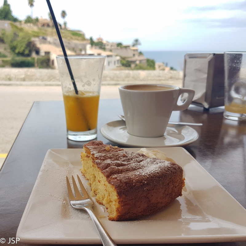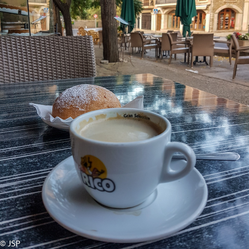 Pusryčiai viešbutyje prasideda aštuntą ryto, o mes ketinome išeiti anksti, tad pusryčių atsisakėme. (Realiai galėjome ir papusryčiauti, nes iš miestelio vis tiek išėjome tik po devynių.) Apie aštuntą paliekame viešbutį ir einame link Deia centro. Norisi kavos prieš žygį, bet kavinukės dar uždarytos arba tik atsidarinėja. Miegaliai tie ispanai! Vienoje vietoje apsimiegojusi padavėja pataria, kur visgi galėtume gauti kavos, ir netrukus jau sėdime pilnutėlėje kavinėje miestelio pakraštyje, gavusios vos ne paskutinį staliuką lauke. Imam cortado kavos, ir klausiam padavėjo, ką skanaus turi prie kavos. Padavėjas rekomenduoja tradicinę maljorkietišką bandelę – ensaimada. Man ji labai skani, o bičiulei vėl per saldu ir per riebu. (Na nesupranta ji nieko apie saldumynus! Užtai apie jūros gėrybes daug galėtų papasakoti, skirtingai nei aš, jų nekenčianti.)