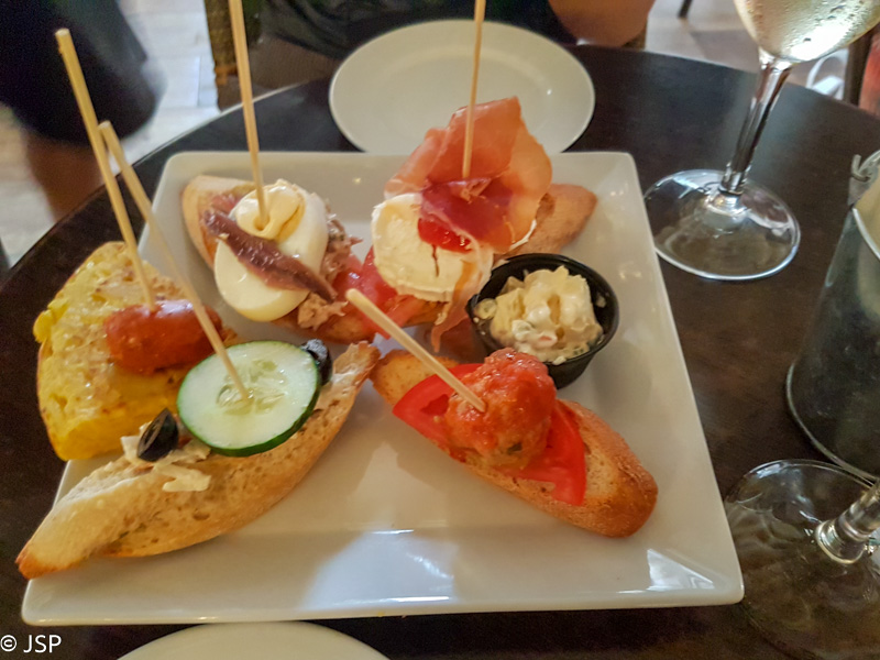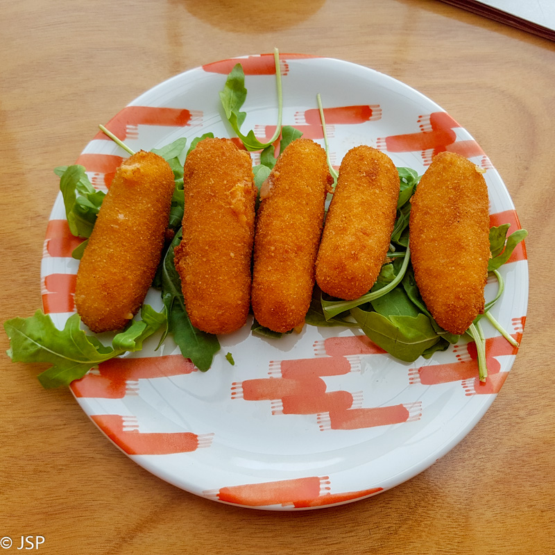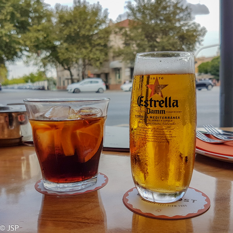 Be nuotykių sugrįžę į Palmą, pirmiausia užsukame į kavinukę netoli stoties. Dar Korsikoje tai tapo mudviejų tradicija – žygio dieną pabaigti alaus bokalu, atvėsti, atsipūsti, aptarti dienos įvykius ir nuotykius, o tik paskui jau ruoštis, praustis, tvarkytis. Šiaip jau aš alų mėgstu nebaisiai, tad šįkart renkuosi vermut casero – rudąjį vermutą su apelsinų griežinėliais (labai skanu!) Dar įkalbu bendražygę pasiimti užkandai sobrasada dešra įdarytų kroketų – irgi skanu, abi liekam patenkintos.