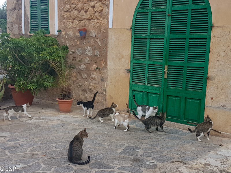 Atsigaivinę po dušu, einame apžiūrėti Deia miestelio ir pavalgyti. Miestelis labai jaukus, bet ištisai tenka eiti arba aukšyn, arba žemyn. Mes šiandien jau pakankamai prisilaipiojom, tad einame tiesiai į centrą, kur susispietę restoranai ir kavinės. Pakeliui dar aptinkam kačių sambūrį – už tų durų matyt gyvena kažkas, kas jas reguliariai maitina.