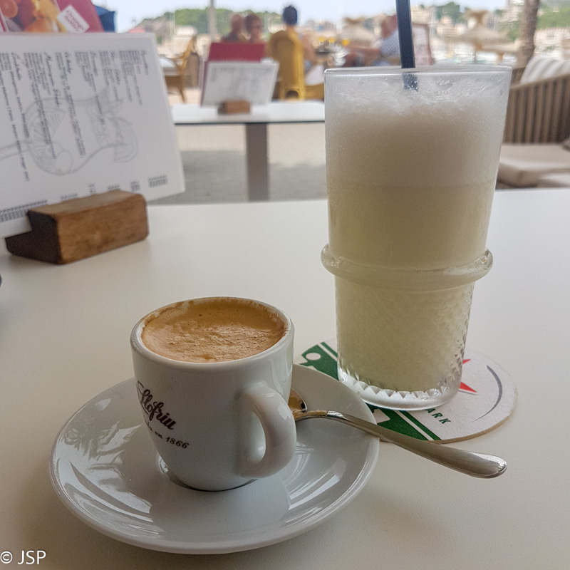 Port de Soller pakraštyje dar kartą atsigėrusios šviežių apelsinų sulčių (jau beveik nesinorėjo, bet pardavėjas labai nuoširdžiai siūlė), pakrantės promenadą pasiekiame apie pusę keturių. Prisėdame ant patogių minkštų sofų vienos iš daugelio kavinukių terasoje, užsisakome kavos ir šalto pieniško kokteilio, ir ilgokai pasėdime.