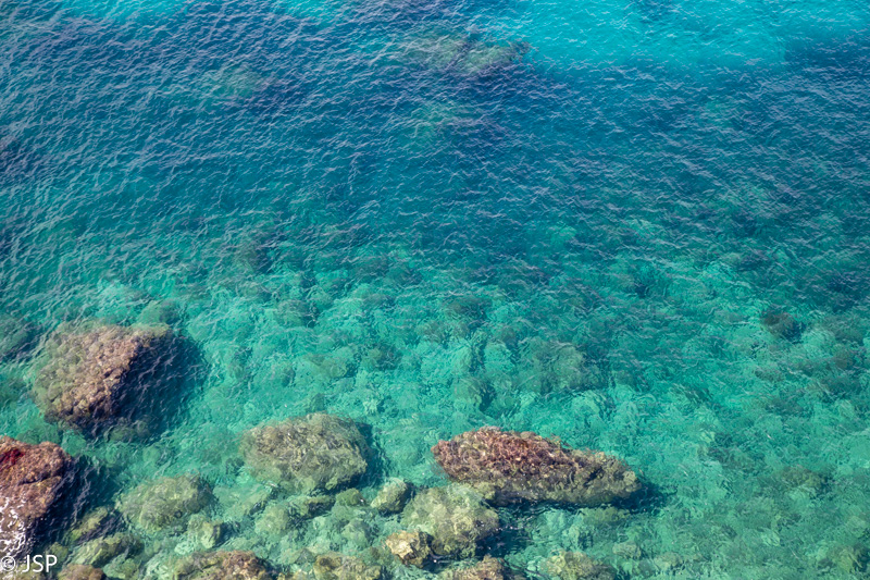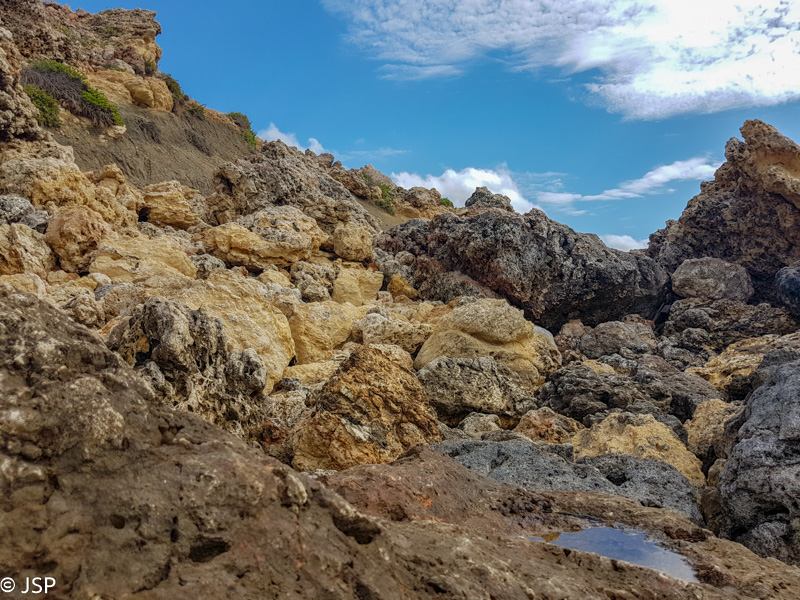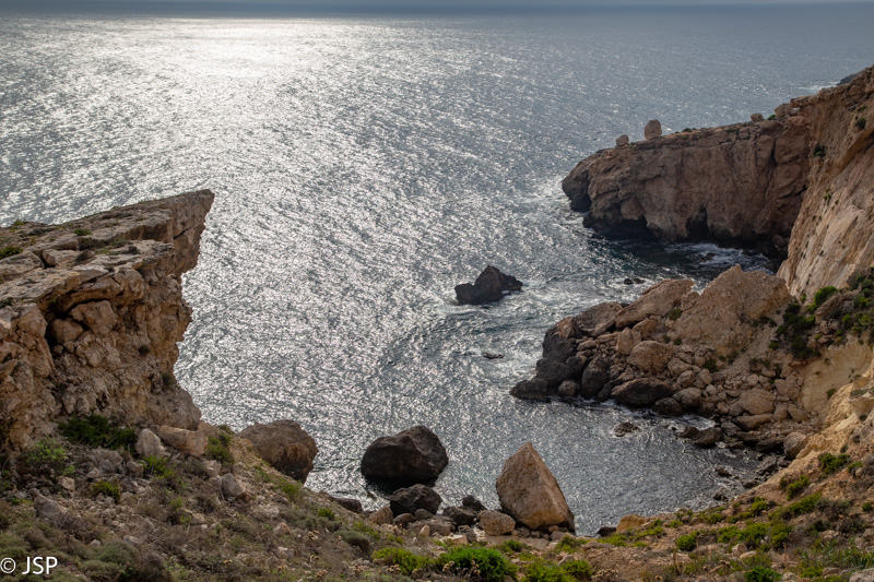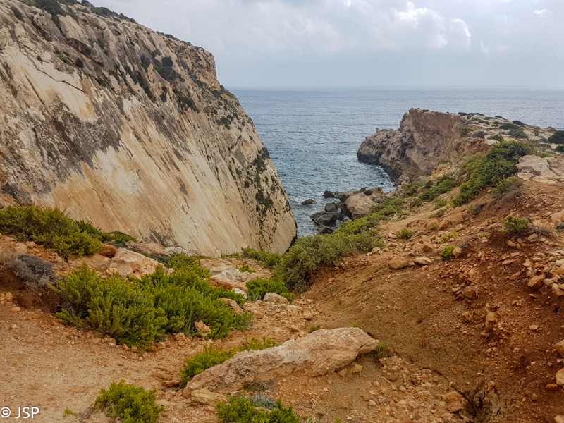 Iškopus iš tarpeklio, takas veda tolyn stačiu ir akmenuotu šlaitu. Jau beveik karšta, ir jokio vėjelio šioje iškyšulio pusėje. Mus labai vilioja vėsiai atrodantis vanduo apačioje – nusileisti per aštrius akmenis sudėtinga, bet turėtų būti įmanoma. Pasakyta – padaryta, ir netrukus jau mirkome kojas vėsiame vandenyje akmenuotoje įlankėlėje, uolų apsuptyje. Aplink tvyro tingi popiečio ramybė, jei būtų įmanoma kažkaip prigulti ant tų aštrių akmenų, tai beveik ir nusnūsti norėtųsi…