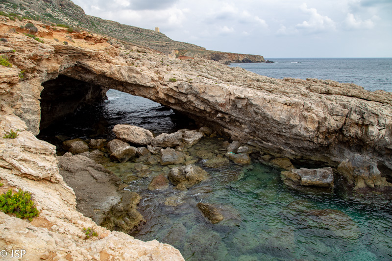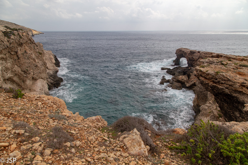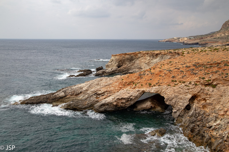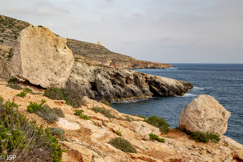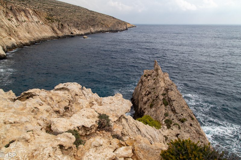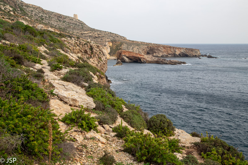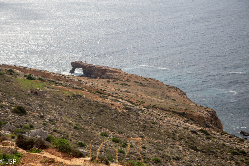 Kaip jau minėjau, šiuo taku iš Ghar Lapsi galima nueiti iki Ghar Hanex arkos. Paskui galima grįžti atgal tuo pačiu taku, arba, jei keliaujate autobusu, nuo arkos kilti aukštyn iki Tal-Hamrija bokšto ir išeiti į kelią prie Haqar Quim, kur yra autobuso stotelė. Mes taku einame apie valandą, kol pasiekiame ilgą uolų pleištą, išlindusį į jūrą virš siaurutės įlankos. Čia takas dramatiškai baigiasi, toliau – tik status uolos kraštas ir bangų mūša apačioje.