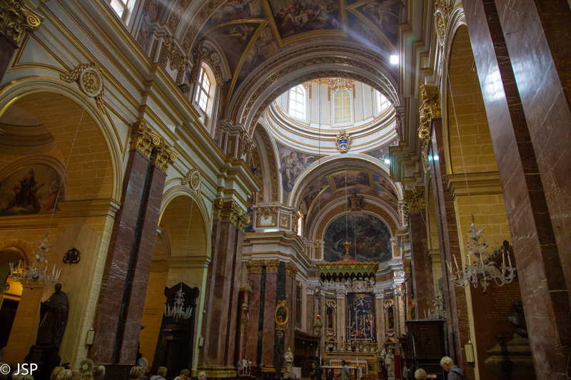 Vaikščiojame be jokio plano ir tikslo, tiesiog einame, kur akys veda. Bet kaip visi keliai veda į Romą, taip Mdinoje visos gatvelės atveda prie šv. Povilo katedros. Elegantiškas baroko stiliaus fasadas slepia auksu ir marmuru tviskantį interjerą su freskomis ištapytu kupolu ir spalvingomis grindų mozaikomis.