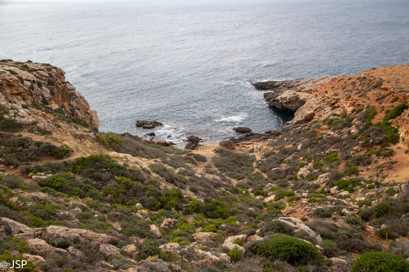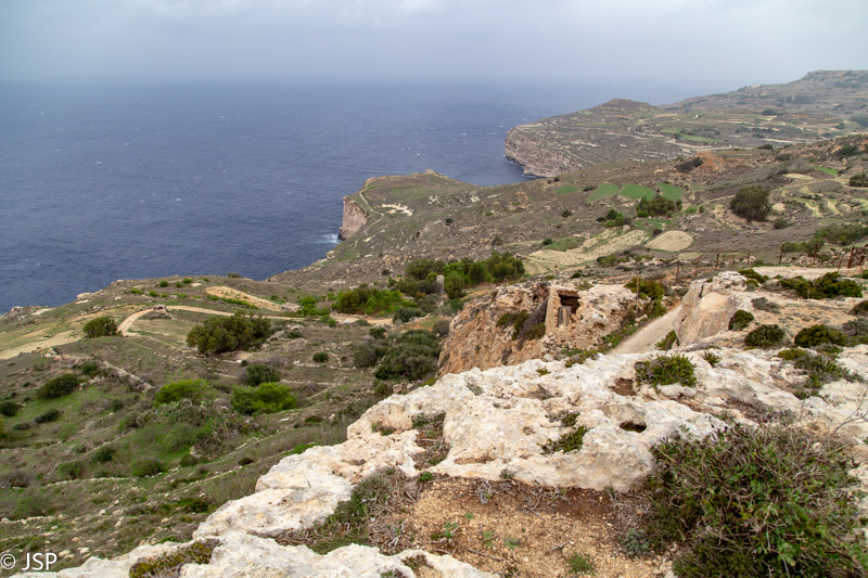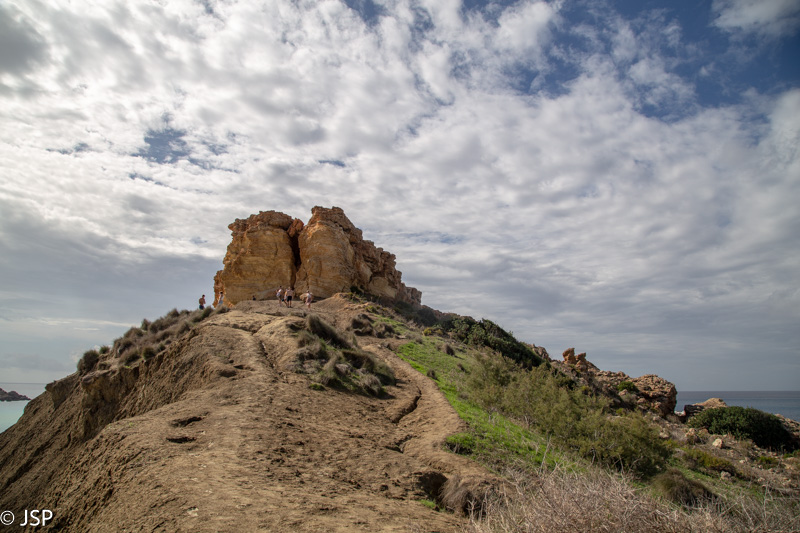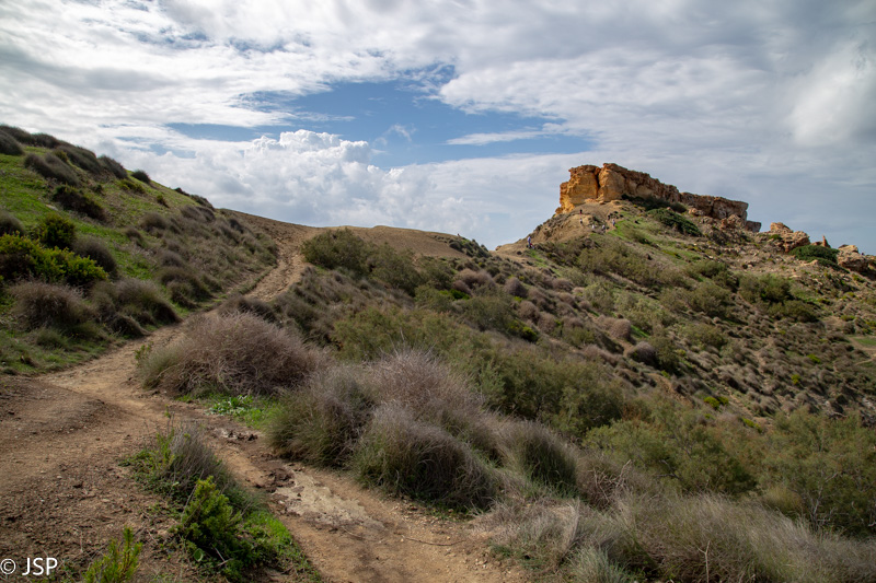 Papietavę susirandame aukštyn nuo pliažo vedantį taką ir vėl kopiame aukštyn. Takas smarkiai dumblinas po lietaus, eiti tenka labai atsargiai, kad nepaslystum. Maždaug per ketvirtį valandos pasiekiame kitą įlankos pusę, ir dabar jau puikiai matome iškyšulį ir uolų masyvą ant jo. (Nei Google Maps, nei maps.me nėra šio iškyšulio pavadinimo, jį vėliau radau Maltatina bloge – Ras il-Quarraba.)